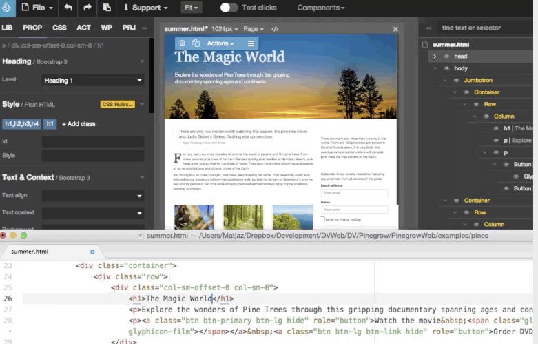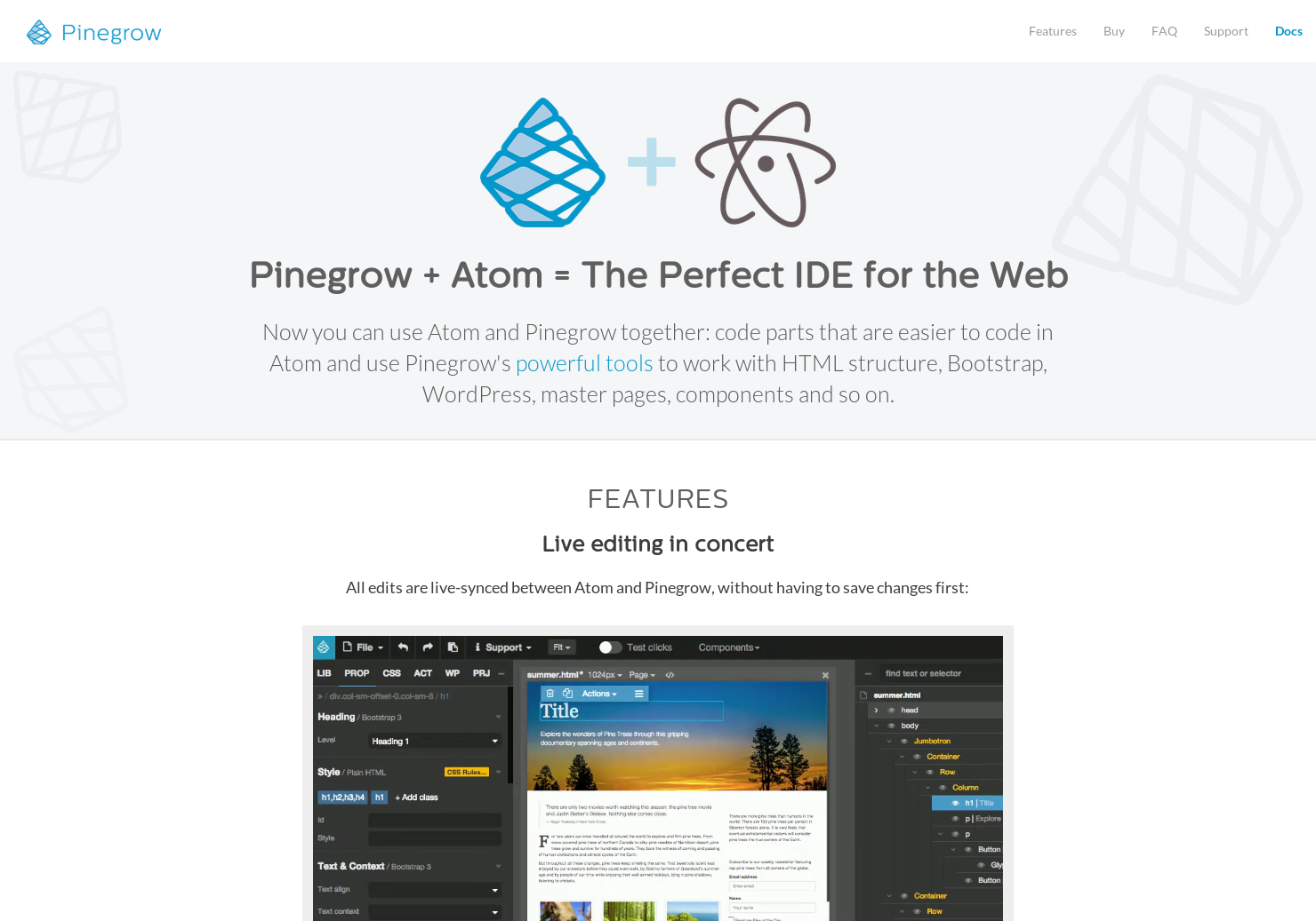 Now you can use Atom and Pinegrow together: code parts that are easier to code in Atom and use Pinegrow's powerful tools to work with HTML structure, Bootstrap, WordPress, master pages, components and so on.