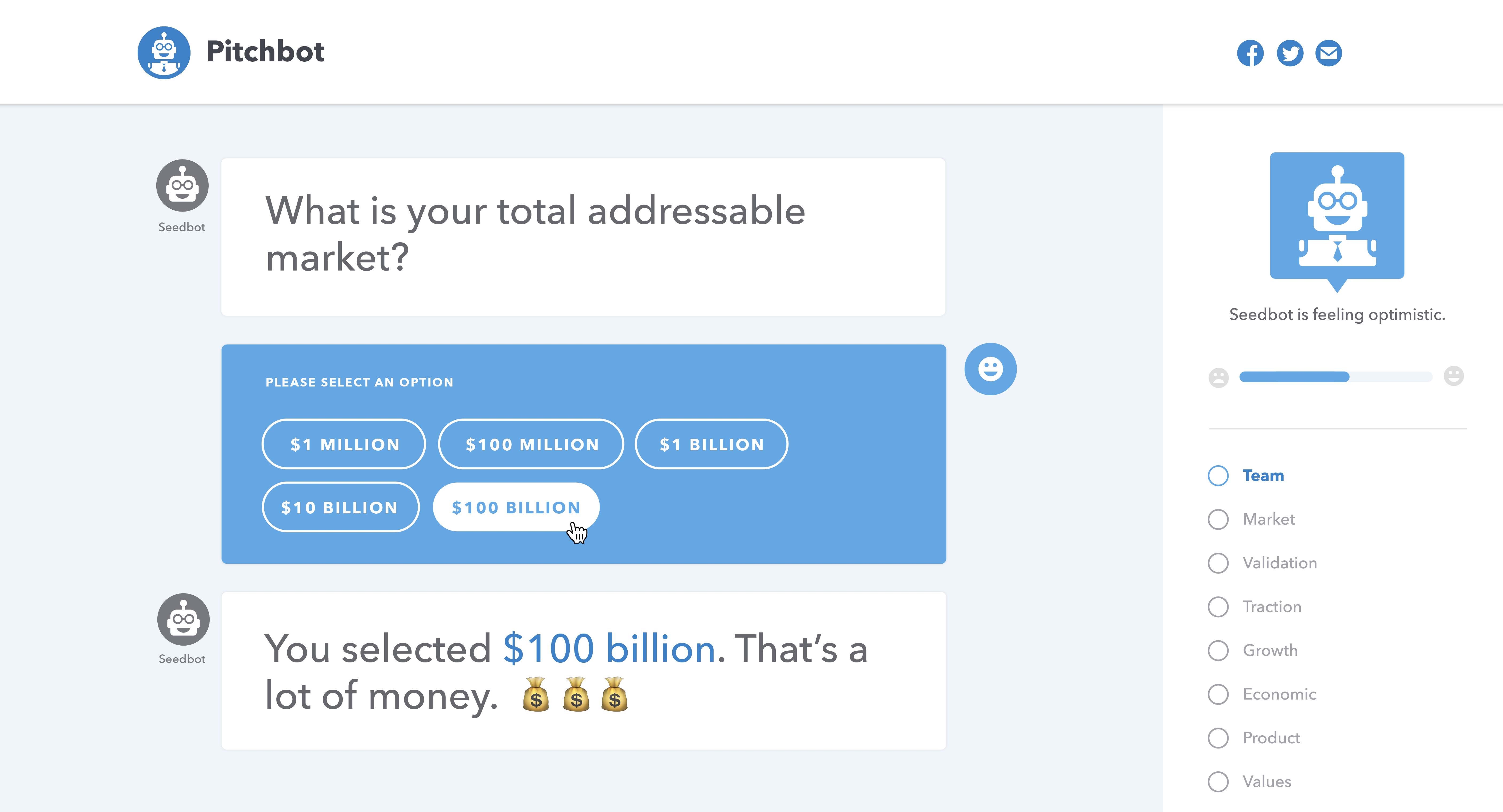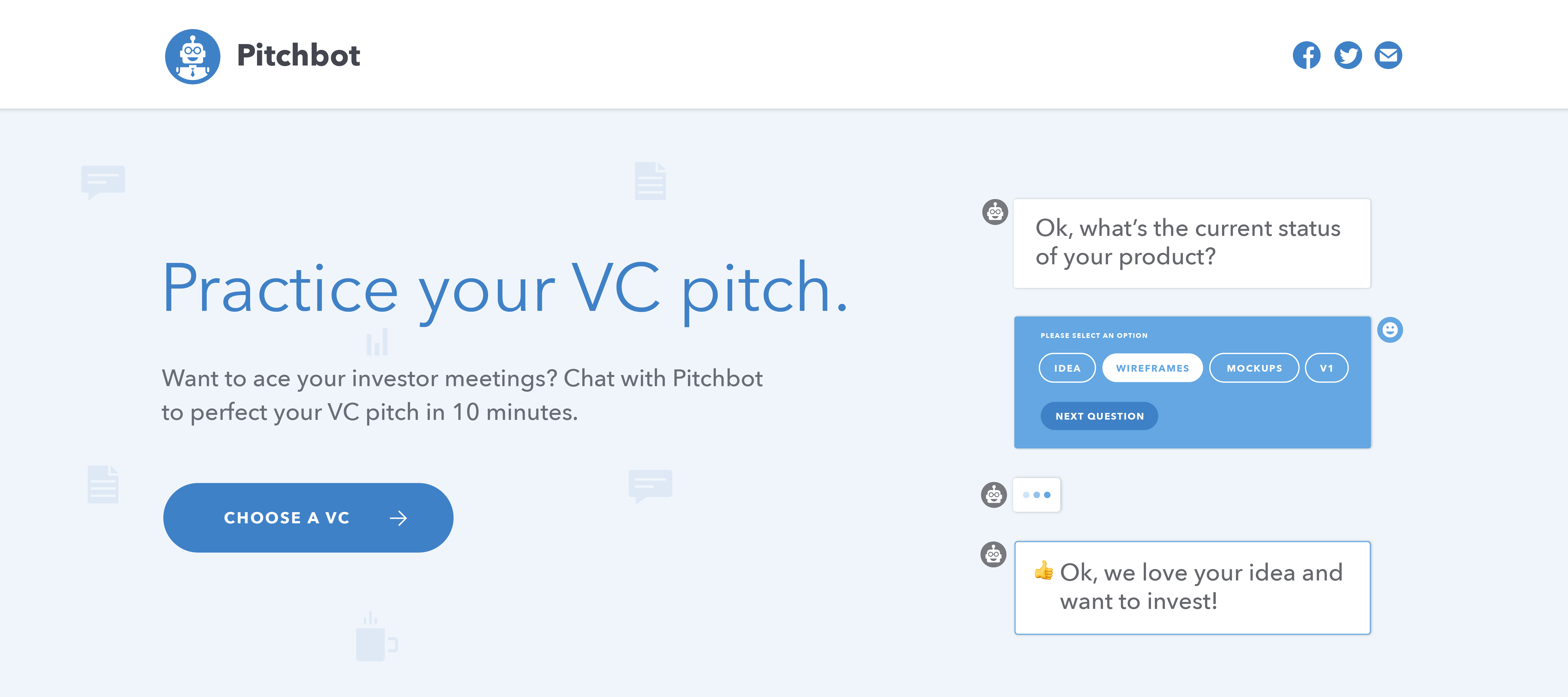 That means the information founders most want is the most difficult for them to get. To help solve this problem, we’ve created a fun and useful tool to help founders hone their pitch. Please meet Pitchbot.