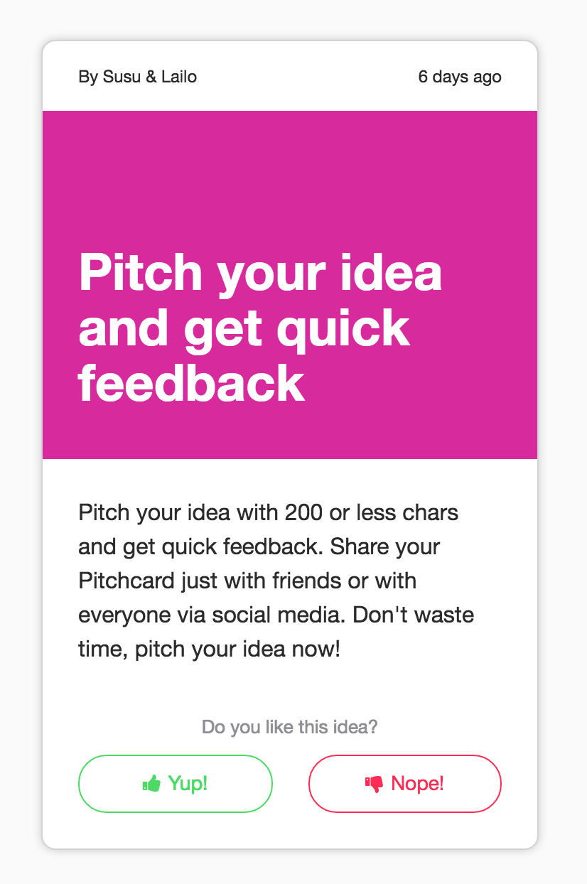 A lot of people around us began to have amazing ideas: “Hey, I have a really cool idea for a new app!”. They usually tried to explain it in a very complex way or sent us very long emails. That’s why we’ve built Pitchcard.io with a 200 chars limit on the description to get quick feedback.
