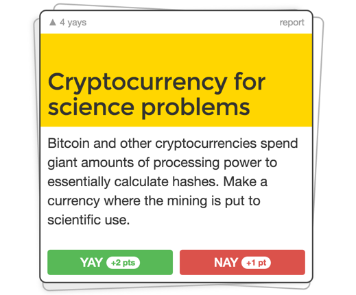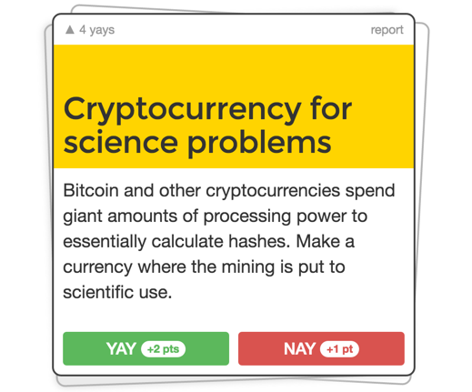 This is so simple yet so awesome + the monetization idea is clever. But I don't understand why YAY is +2 pts while NAY is only +1? For me it seems like that may encourage people to vote YAY more often and the stats for single pitch will always be in favor of YAY. IMO both YAY and NAY should add the same amount of points.