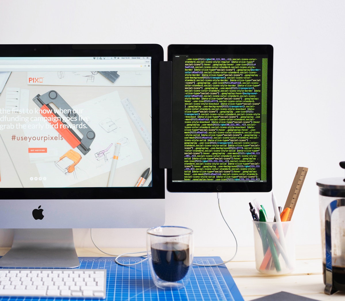 Hi, I am Oscar the designer of Pixo. We made it with the idea of being used with apps like Duet Display or Air Display, taking also advantage of the new Pro tables (12.9") which can give you for example up to 60% more screen when mounted on a regular iMac ( 21.5"). It can be also mounted to other desktops and fits most tablets ( from 7.9" to 12.9"). Your tab… See more