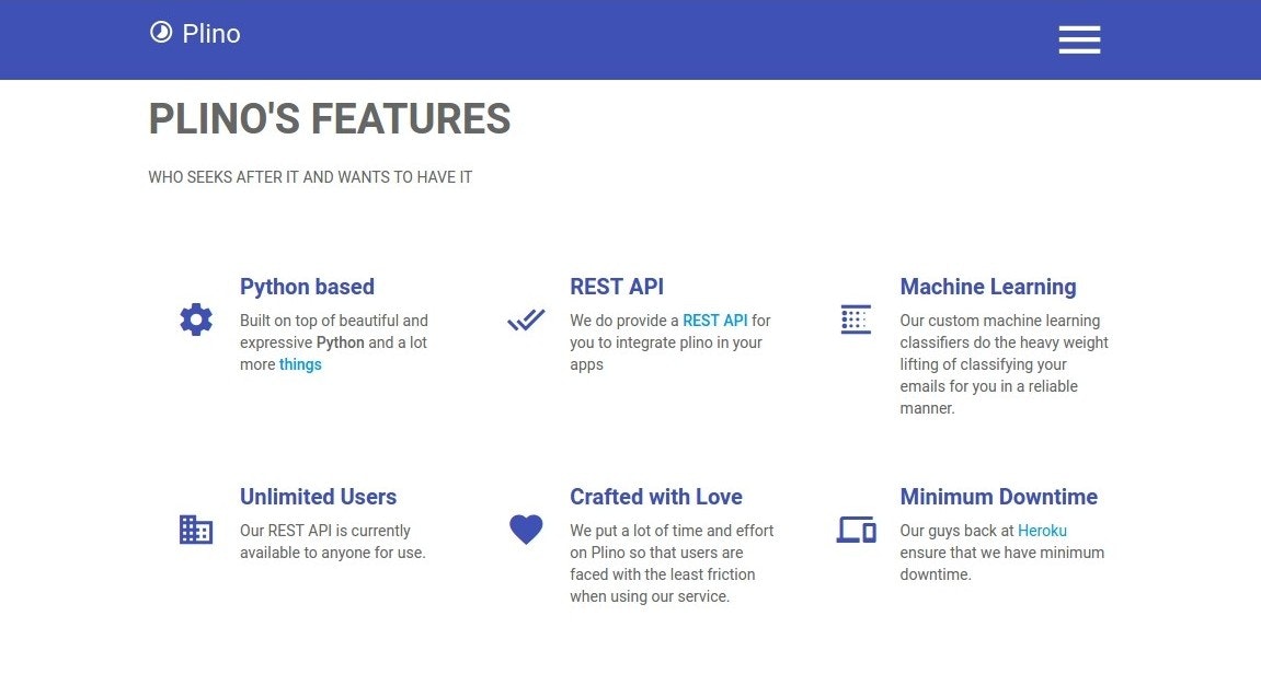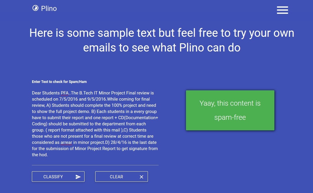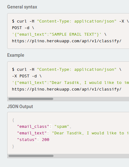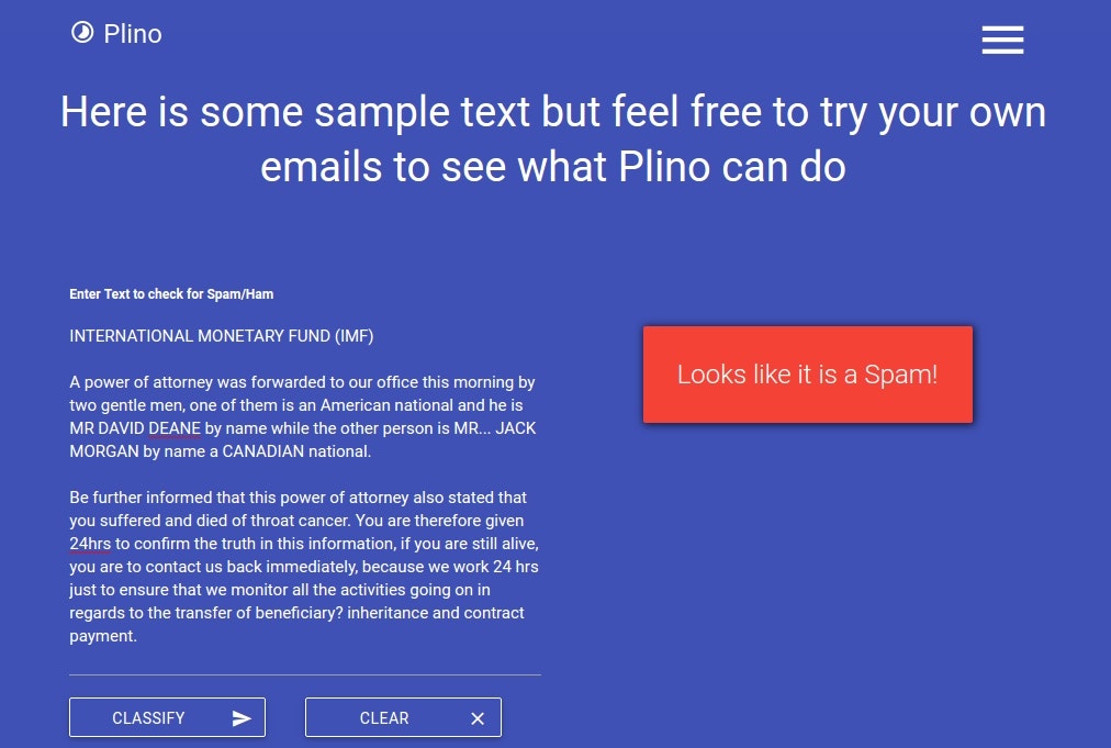 Plino is an intelligent spam filtering system built on top of spammy (https://github.com/prodicus/spammy) (a custom naive bayes spam classifer). You could integrate plino with email services like sendy (https://sendy.co/) or say cuttlefish (https://github.com/mlandauer/cut...)