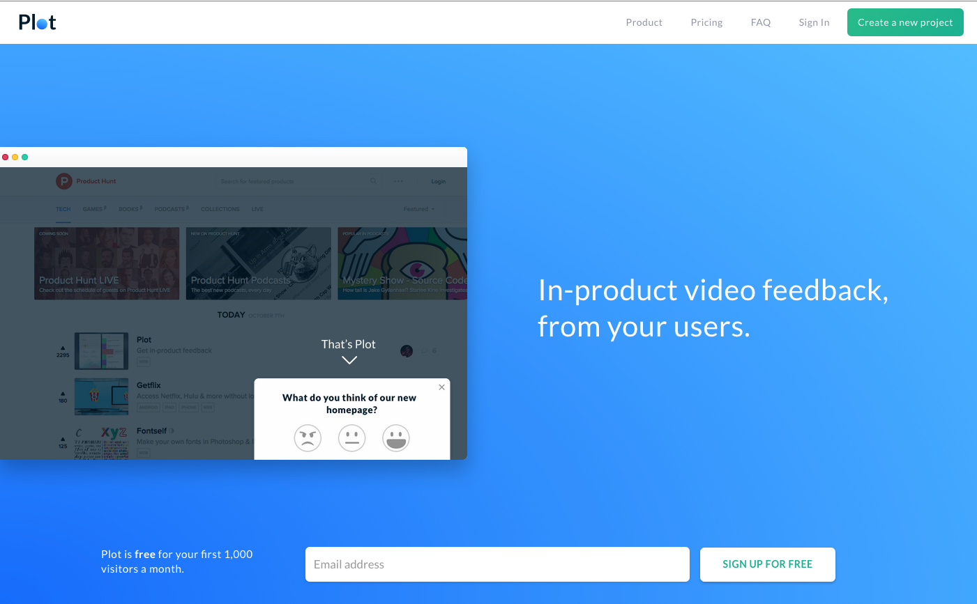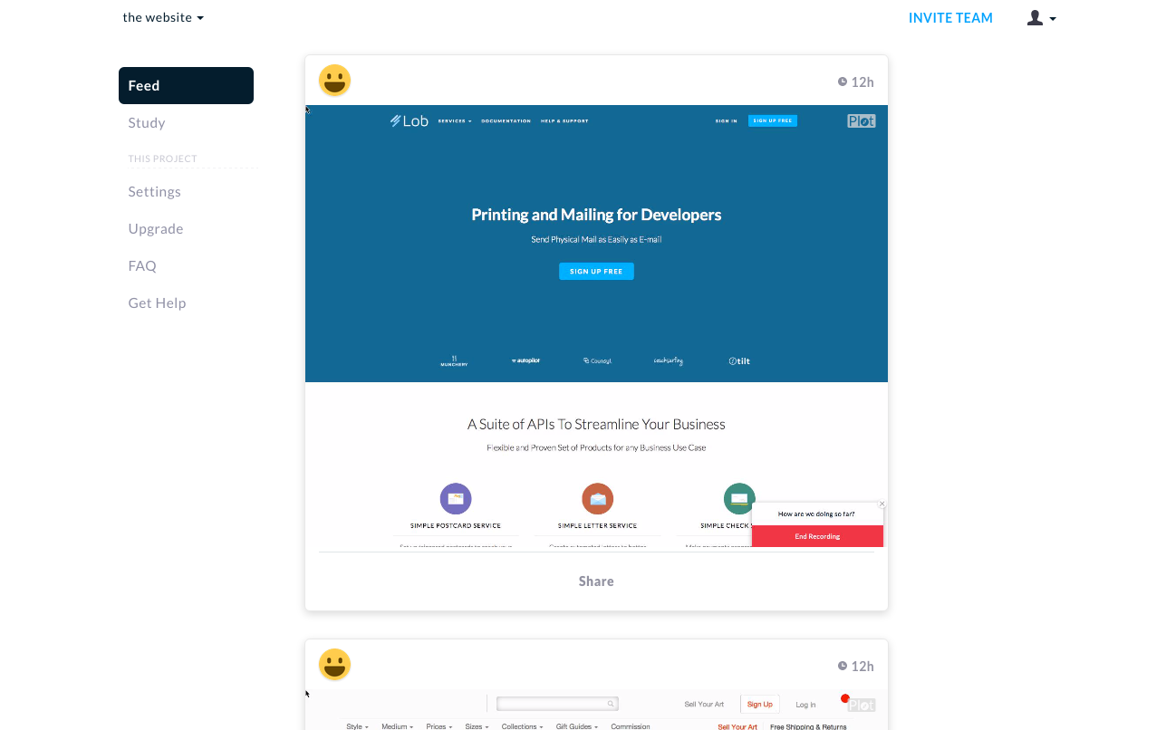 Get in-product video feedback, from your users. With Plot your visitors can share their screen and record feedback videos directly within your website. This allows you to find out where and why users need improvements in your product before they leave.