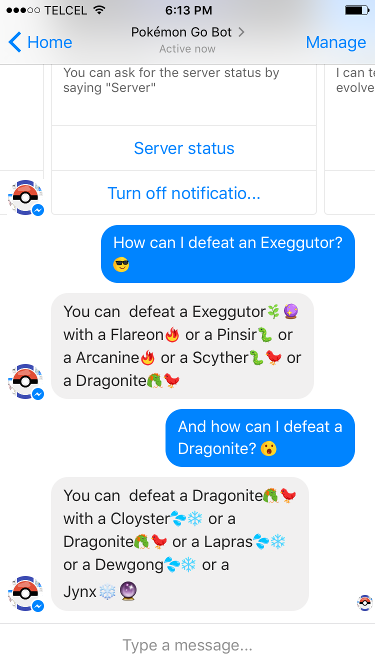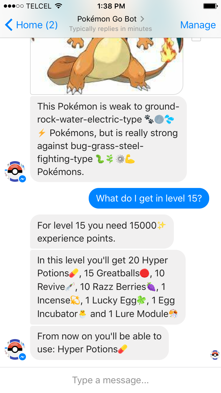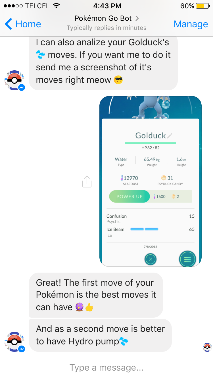 Hello everyone, I made this chat bot from scratch on Node.js that helps Pokémon Trainers with Pokémon Go, it even has image recognition. It hit +1,000,000 messages within it's first week and +50,000 Pokémon screenshots analyzed.