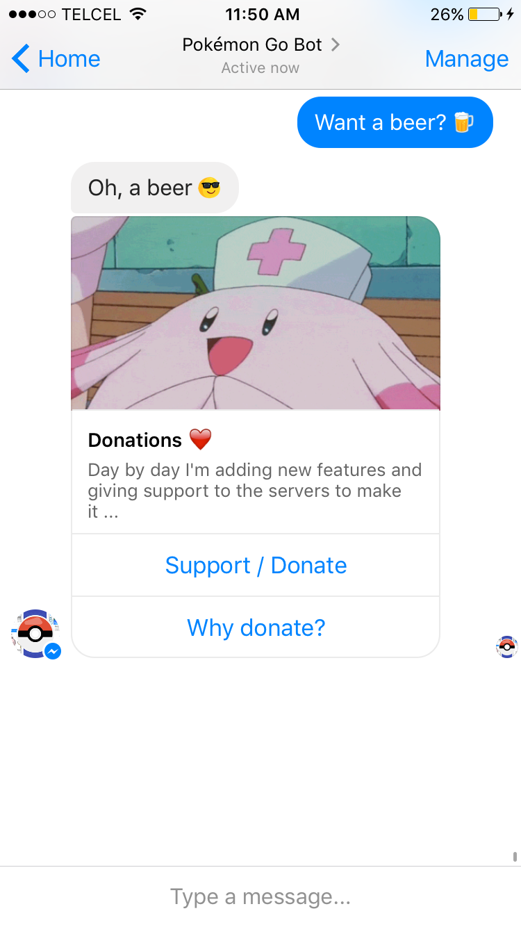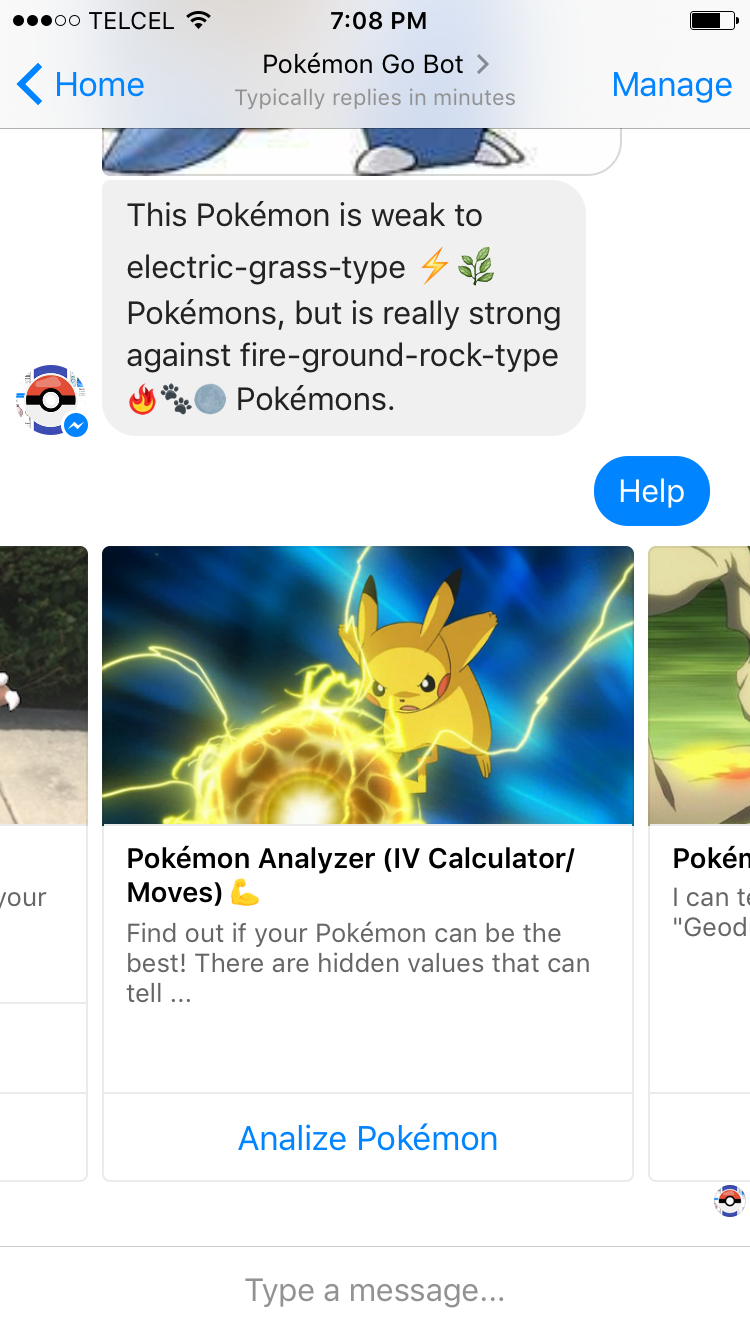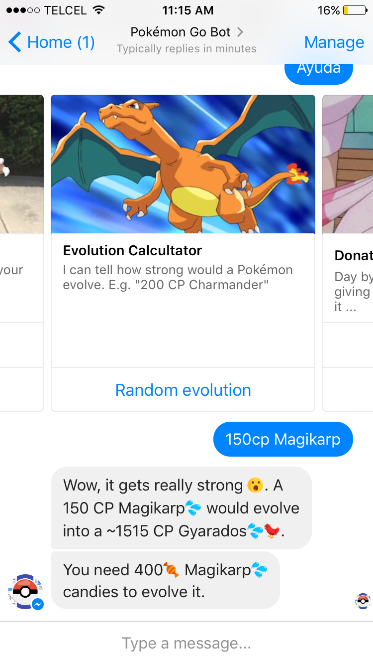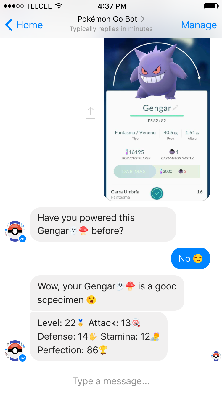 Hello everyone, I made this chat bot from scratch on Node.js that helps Pokémon Trainers with Pokémon Go, it even has image recognition. It hit +1,000,000 messages within it's first week and +50,000 Pokémon screenshots analyzed.