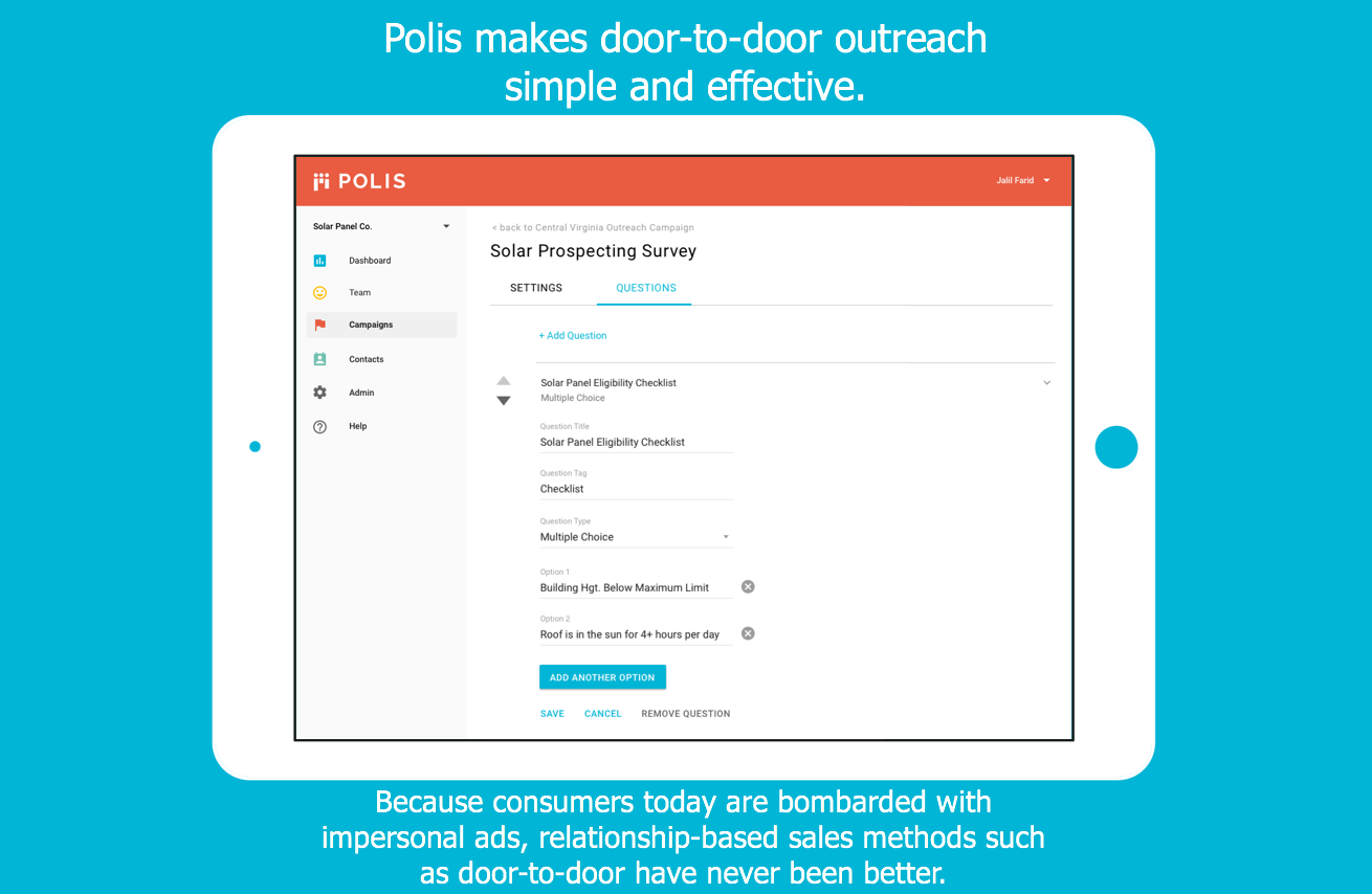 This is Kendall, the CEO of Polis. As you can see, our software platform helps organizations go door-to-door to facilitate in-person interactions. Because consumers today are bombarded with impersonal ads, relationship-based sales methods such as door-to-door have never been more effective. We used to work only in politics (we worked wi… See more