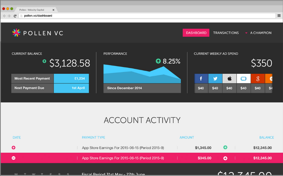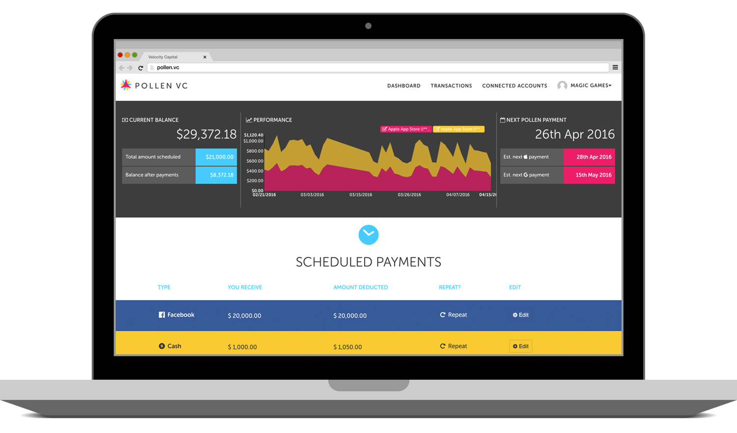 Pollen VC allows developers to unlock their app store revenues the day after you’ve earned them, rather than wait up to 60+ days to be paid out by the platforms. We fund your ad network account with 100% of your revenue – so there is no cost to you. Or you can draw cash against your earnings if you need quicker access to working capital.