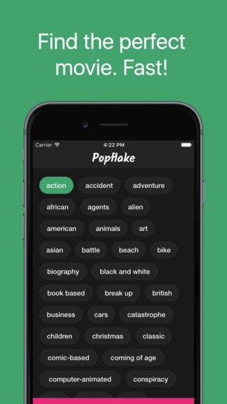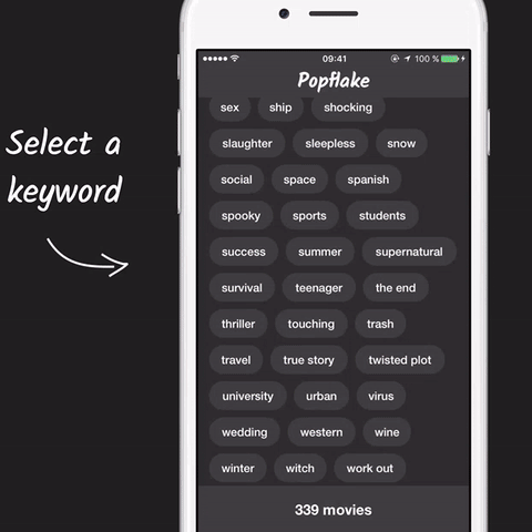 Ever wanted to find some inspiring business movies? Or some scary horror movies with students dying in a forest? Movie discovery becomes really easy and fun with Popflake. Just select the keywords that fit best and you will get awesome movies!