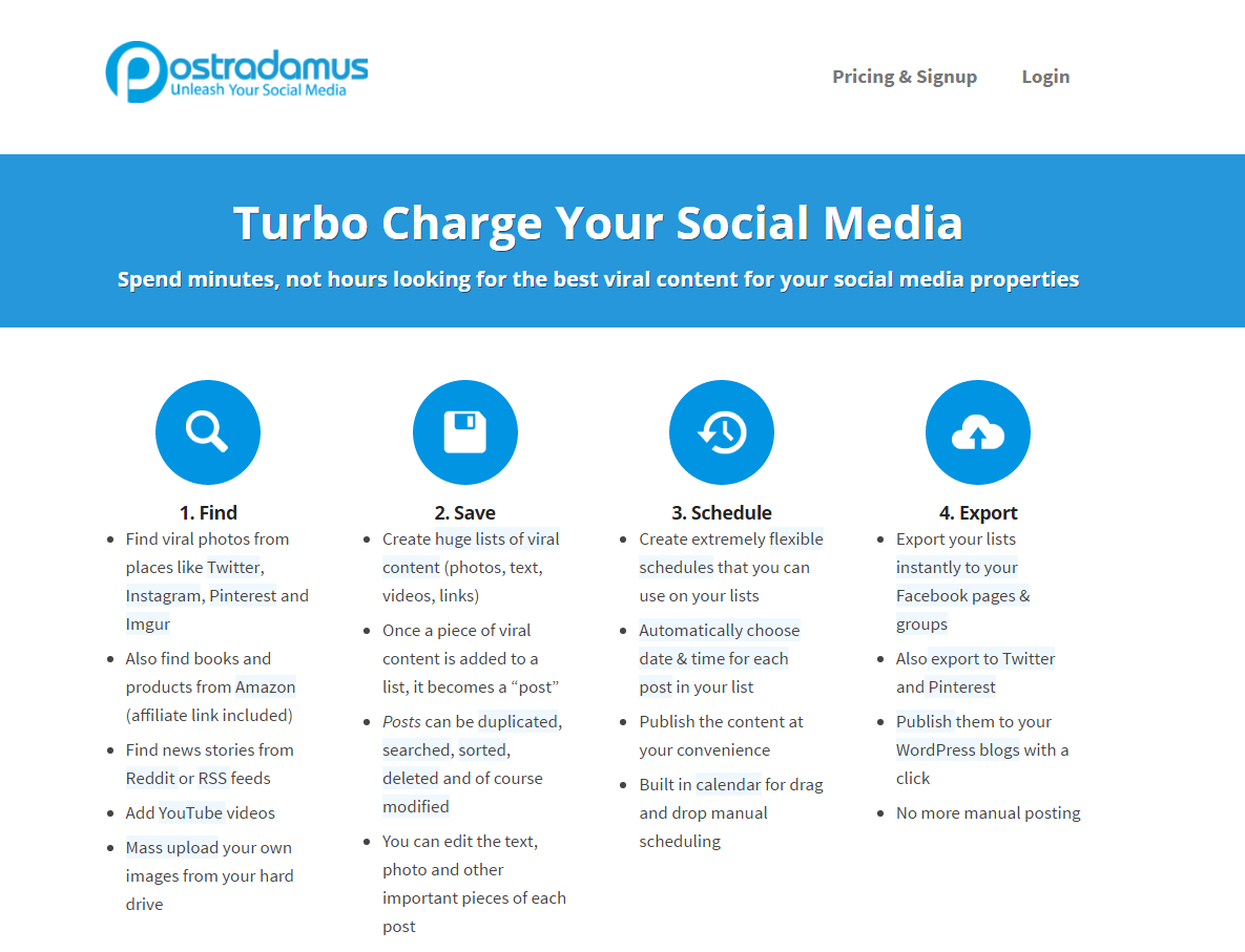 Hi ProductHunt! Postradamus was started about 2 years ago as a way to help myself and others post to their social media properties. I wanted something really flexible but still fairly easy to use. The app is built with 2 main purposes in mind. 1. Quickly and easily find viral content you can repurpose/repost. We have many ways to do that. 2. Build massive lists of that content so you can work on your pages once a month or even once a year instead of daily.