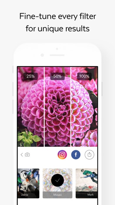 Prisma transforms your photos into artworks using the styles of famous artists: Van Gogh, Picasso, Levitan, as well as world famous ornaments and patterns. A unique combination of neural networks and artificial intelligence helps you turn memorable moments into timeless art.