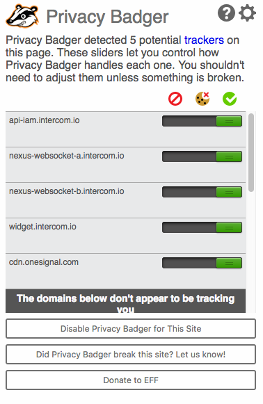"Privacy Badger is a browser add-on that stops advertisers and other third-party trackers from secretly tracking where you go and what pages you look at on the web. If an advertiser seems to be tracking you across multiple websites without your permission, Privacy Badger automatically blocks that advertiser from loading any more content in your browser. To… See more
