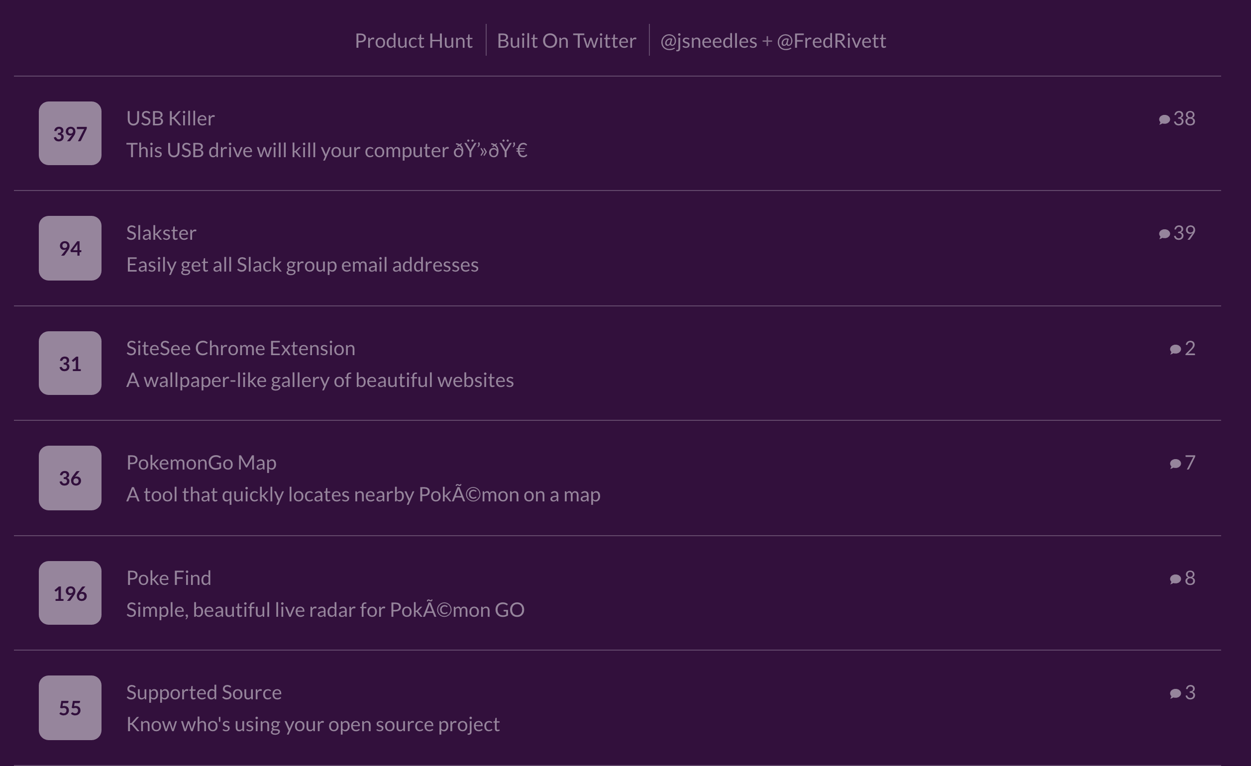 It was incredible to watch this being built on Twitter in real time. From idea to final product in less than 24 hours - amazing! @jsneedles & @FredRivett - great job on finishing this so quickly. Please donβt let Product Haunt die. π