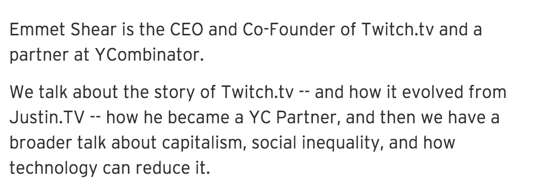 I talk with @eshear about the story of Twitch.tv -- and how it evolved from Justin.TV -- how he became a YC Partner, and then we have a broader talk about capitalism, social inequality, and how technology can reduce it.