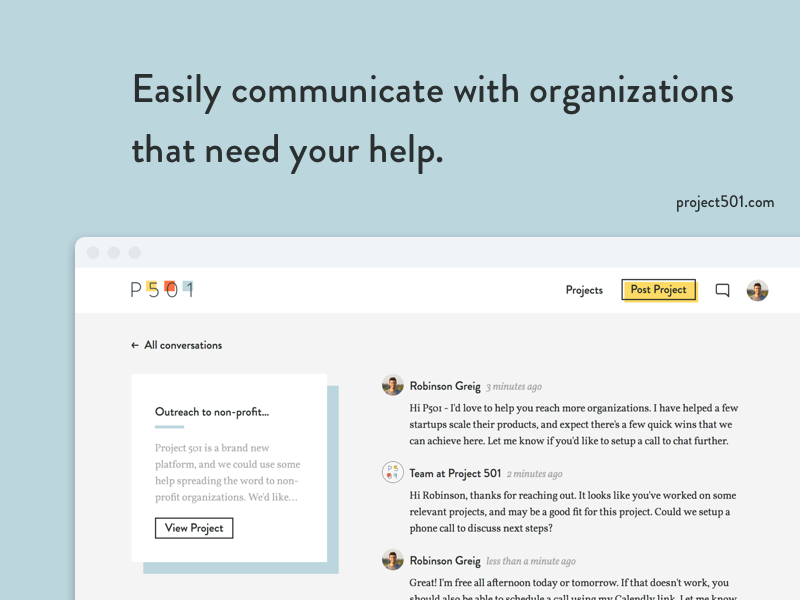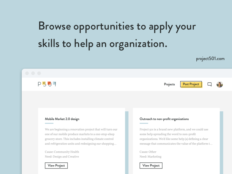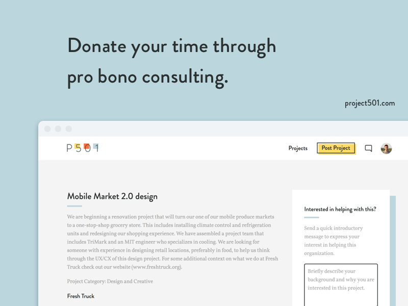 Hiya Product Hunt - I'm excited to share Project 501 with you all! Project 501 matches non-profit organizations with talented professionals who want to donate their skills.