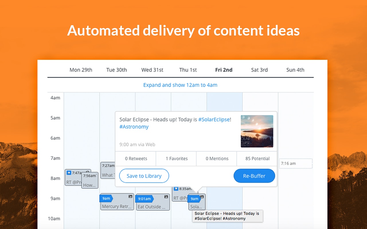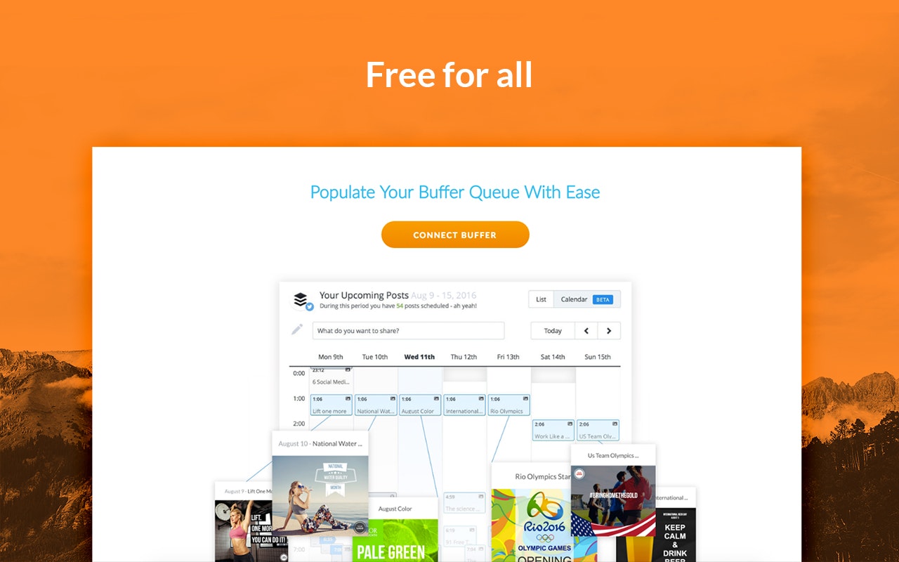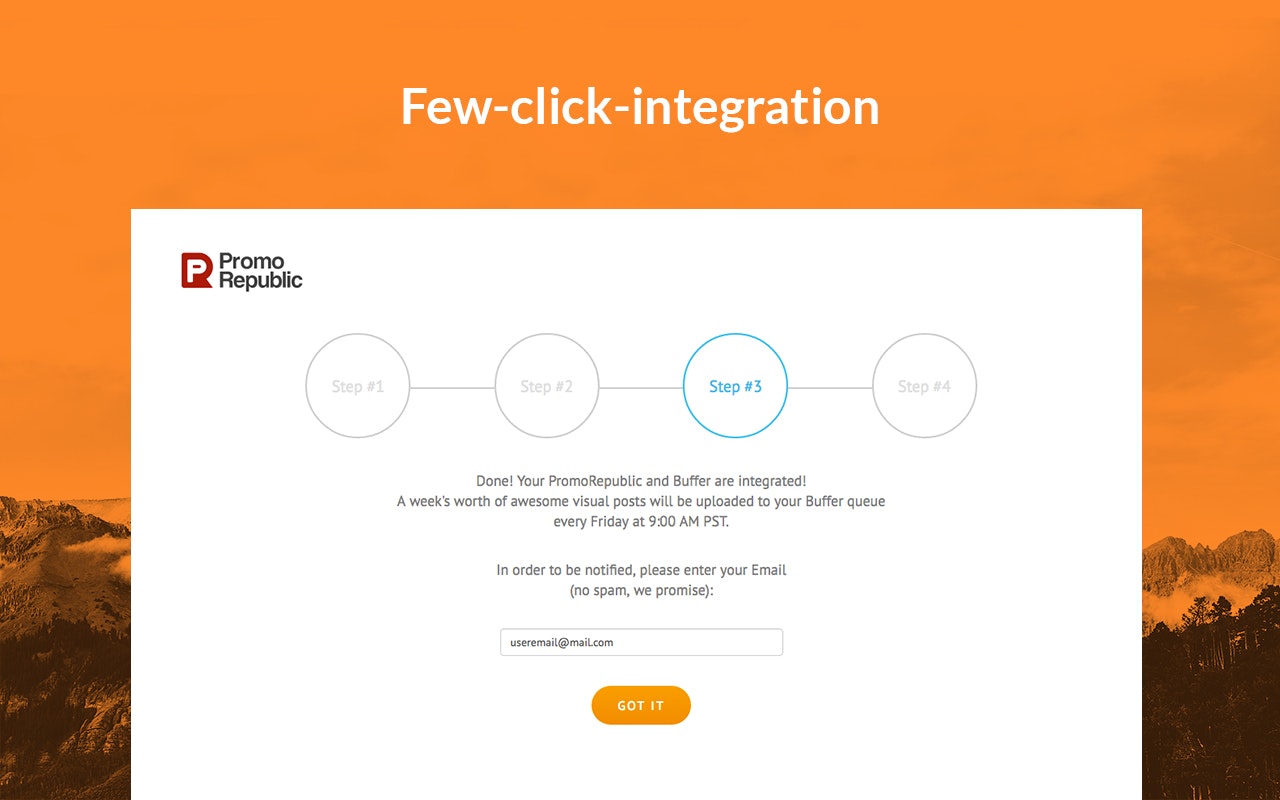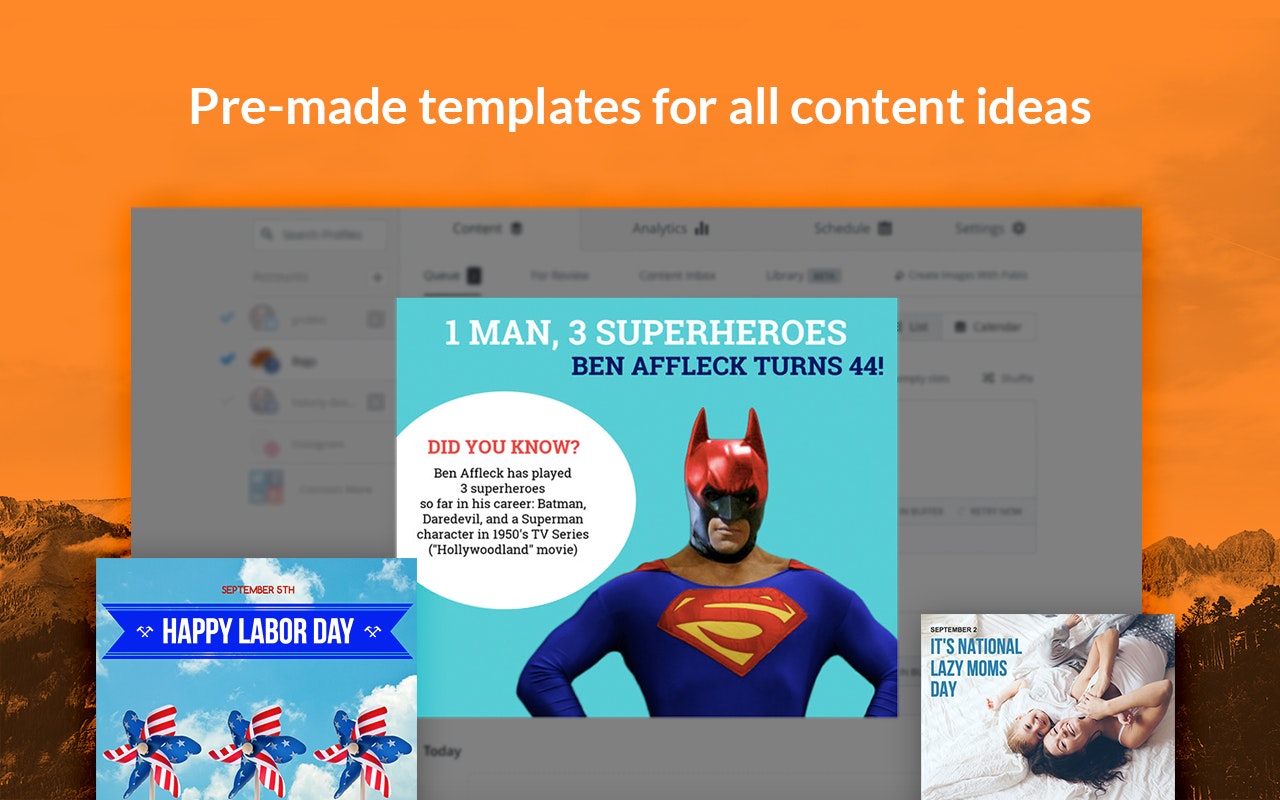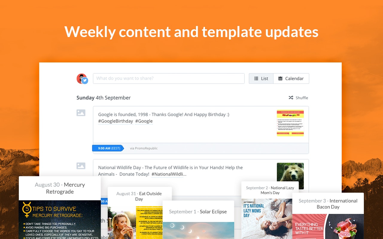 PromoRepublic delivers content ideas based on holidays, historical dates, events and trends directly to your Buffer queue. Always know what to post with over 1500 post templates and 1000 content ideas. Relevant ideas and templates will be delivered to Buffer automatically and for free.