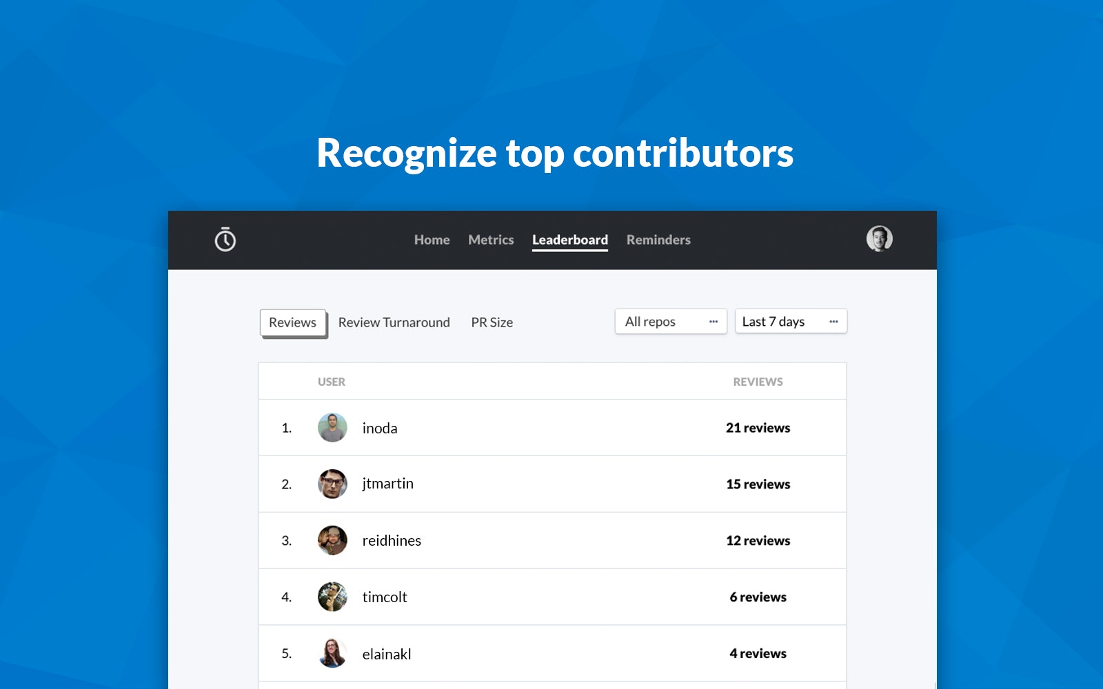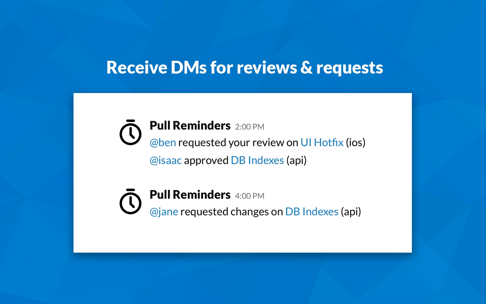 Pull Reminders helps you ship faster with automated Slack reminders and pull request metrics. Used by dev teams at 400+ companies like Pivotal, Instacart, Instructure, and Trivago. Available in the Slack App Directory and GitHub Marketplace.