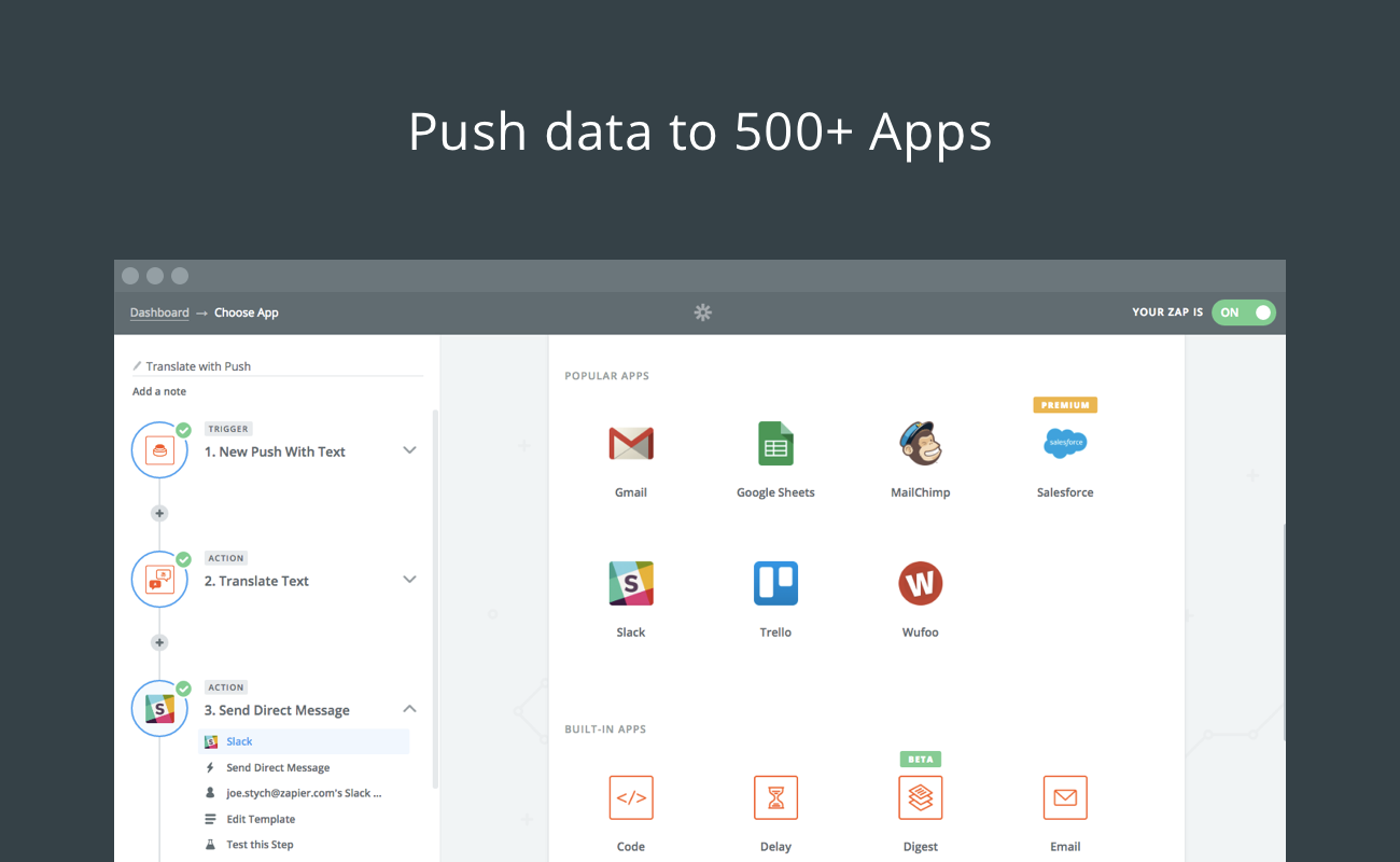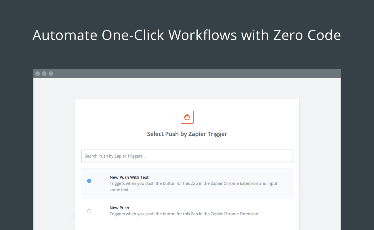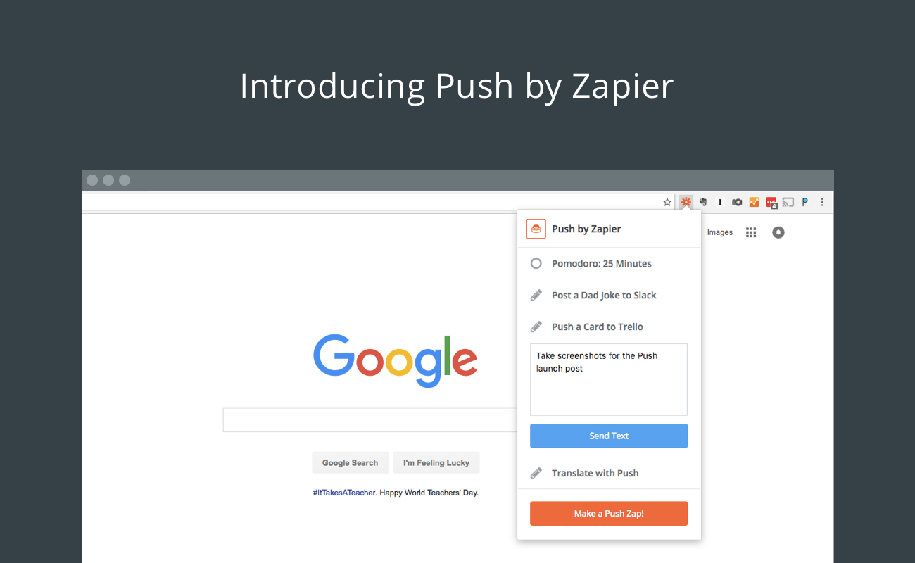 Today we officially launched our new app and Chrome extension: Push by Zapier. Generally, Zapier automates your apps in the background, and you don't need to think about it. But sometimes, you just want to press a button and watch your workflow run.