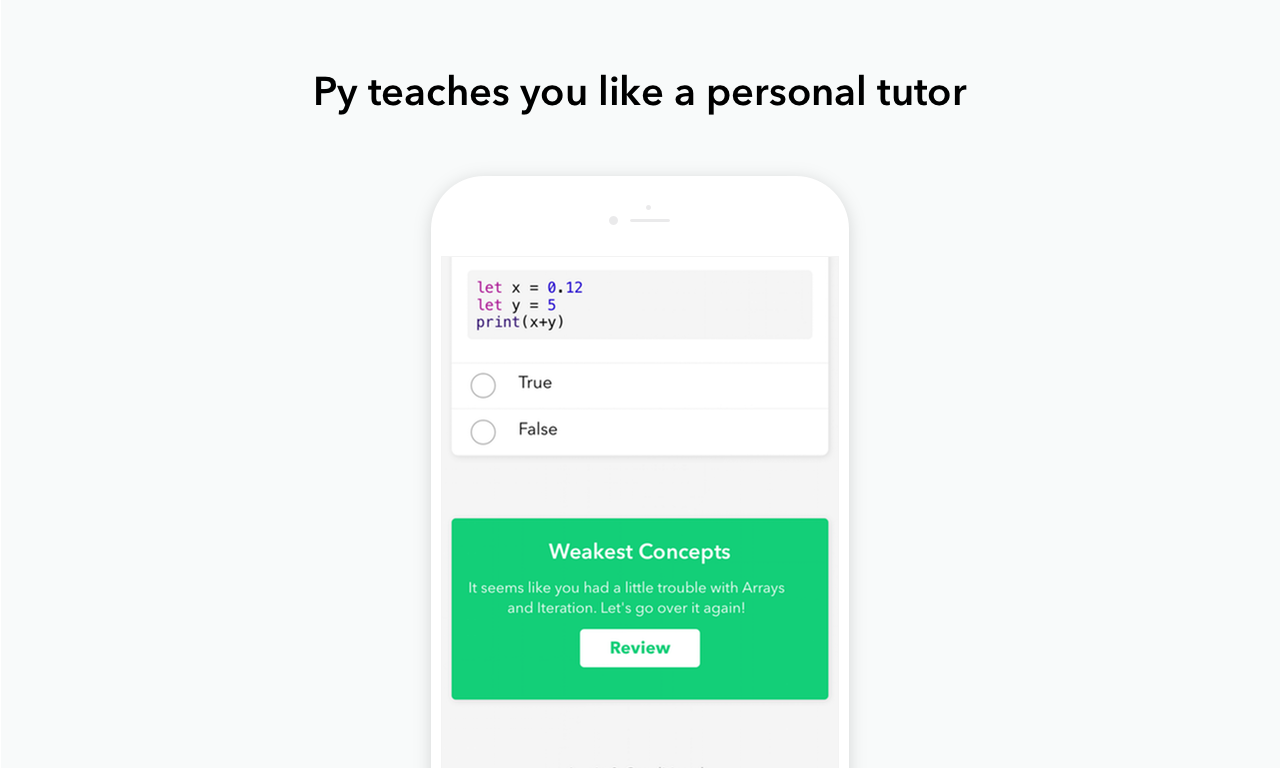 Py is a way to learn on your phone that focuses on interactivity and responsiveness. Py figures out what concepts you're weak in and asks you to review them. It keeps you engaged by tracking your progress, letting you earn points, and level up. We've been fortunate enough to build the content with professors, engineers… See more
