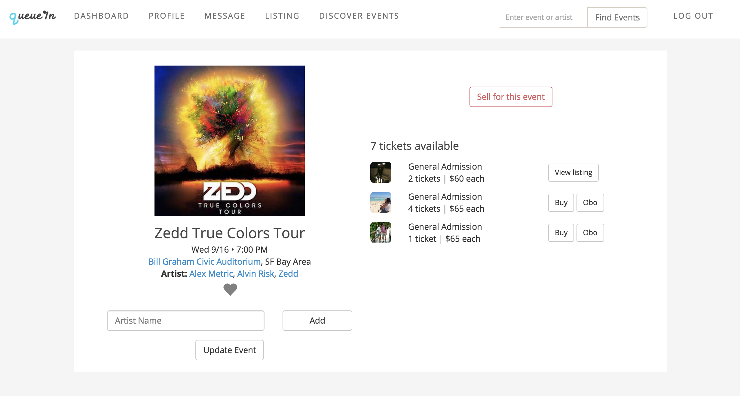 queueIn offers peer-to-peer secondary ticket marketplace for music fans. queueIn lets fans connect directly and complete ticket transactions for free, no commission or service fees charged.