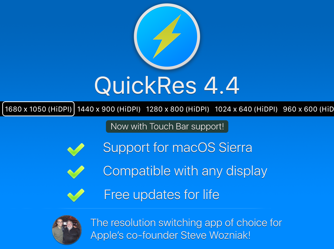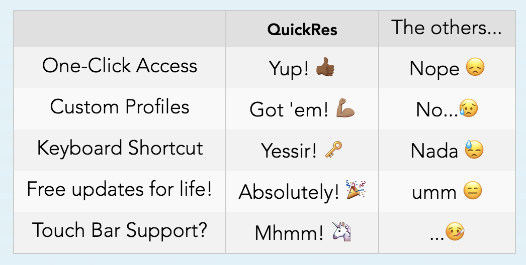 Hi ProductHunt 😺! We're such a huge fan of this community and have discovered so many great products here. We wanted to give back and offer 50% off 💸 QuickRes! In our latest update we've added brand new Touch Bar support so now you can access all your resolutions right from your Touch Bar! You should also check out our new list of supported resolutions (se… See more