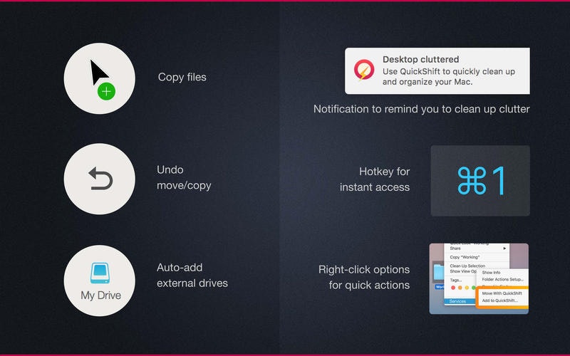 Handy utility for the Mac to reduce Desktop clutter that stores your designated files in their predefined folders. This can of course all be done automatically via OS X's Folder Actions and system services, but this is a pretty nice option for users who don't like DIY solutions.