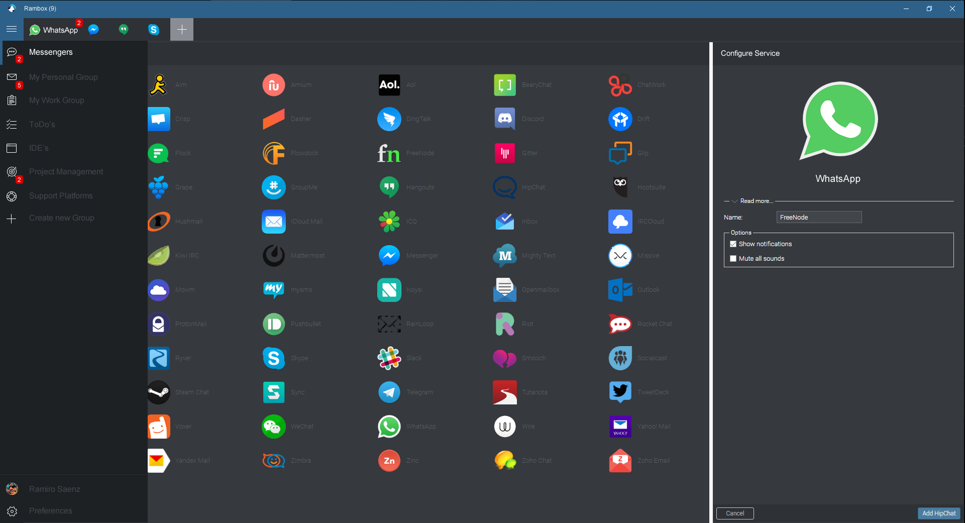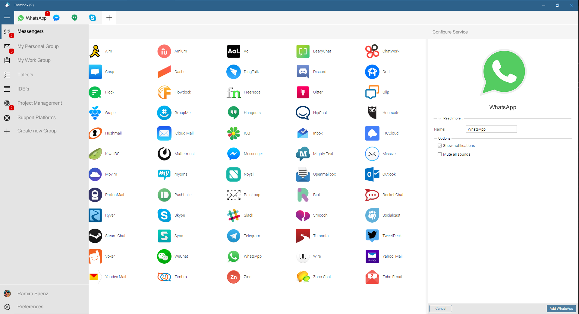I use it everyday. I got tired of constantly switching between various dedicated apps (Hangouts, Slack, etc.) Rambox lets me keep all my messaging in one place, one icon, one red badge. Thank you!