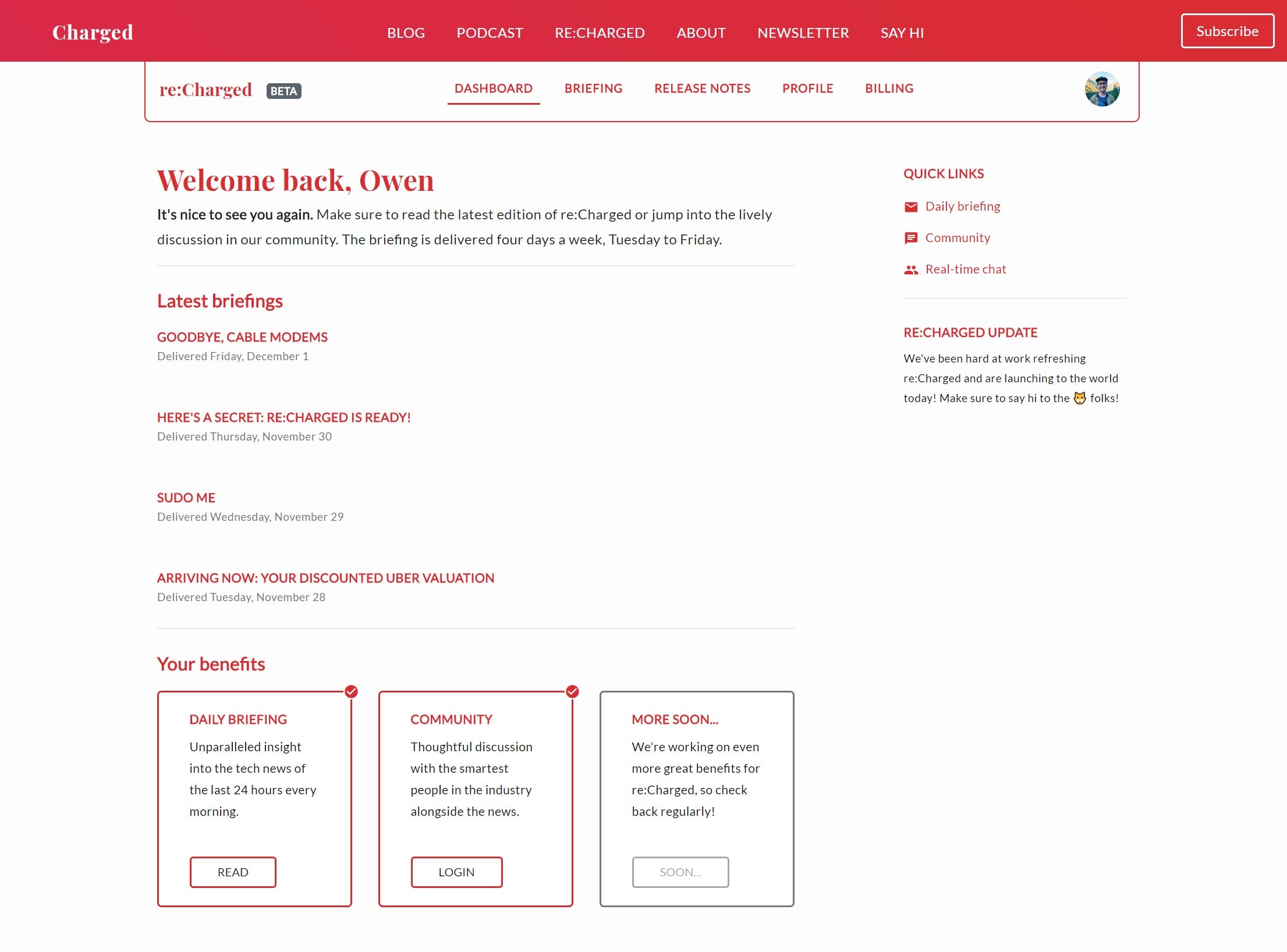 I've been a part of Owen's beta over the last few months for re:Charged and I'm a big fan. It's timely, interesting, and relevant content. It's like he knows about the stories that matters to me and cuts through the BS to deliver the relevant parts.