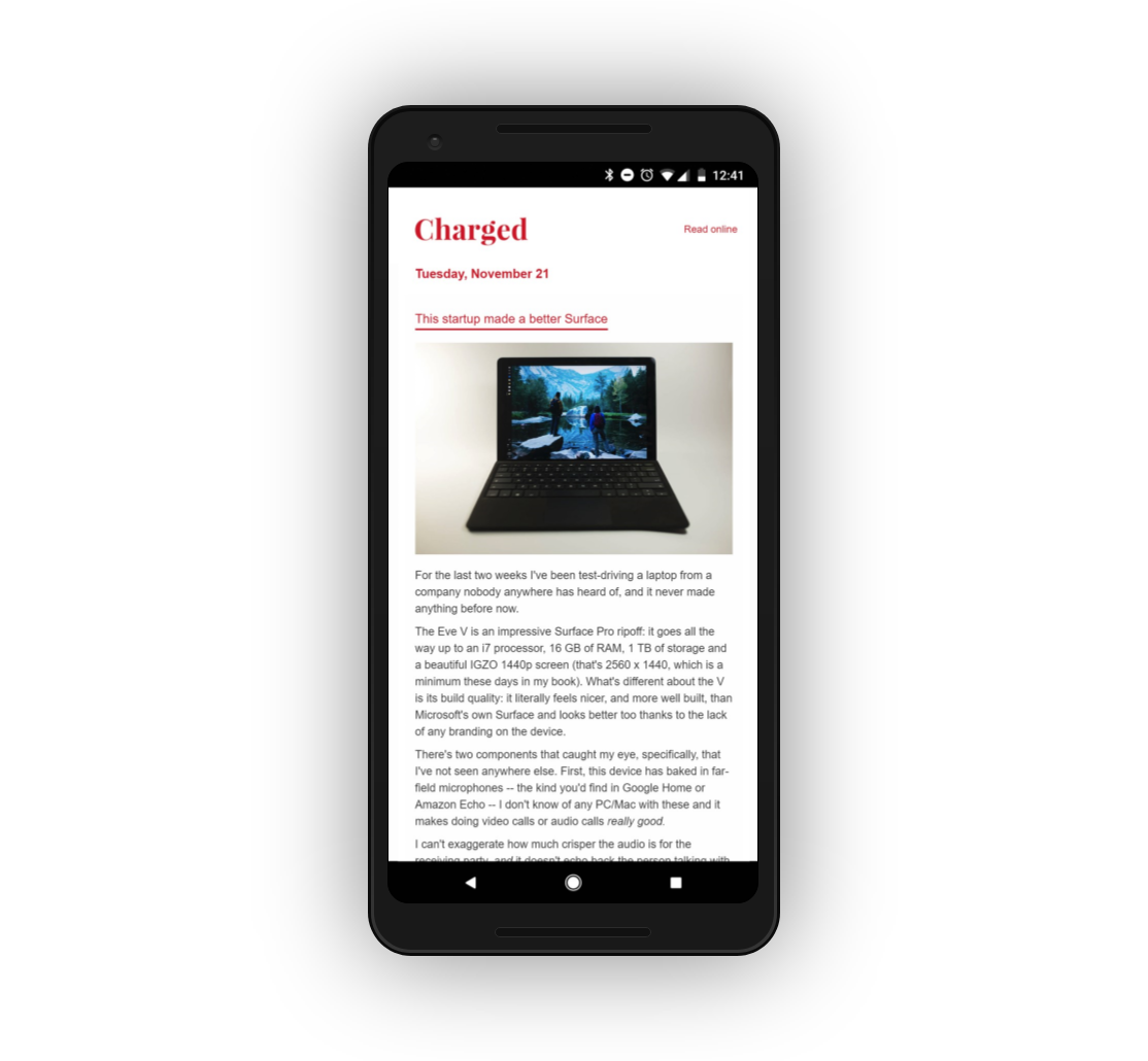 I've been a subscriber to the re:Charged newsletter since day one and it has genuinely stopped me from visiting any tech-related websites. I don't have to worry about missing anything and if I don't feel like catching up I can always just delete the email anyway.