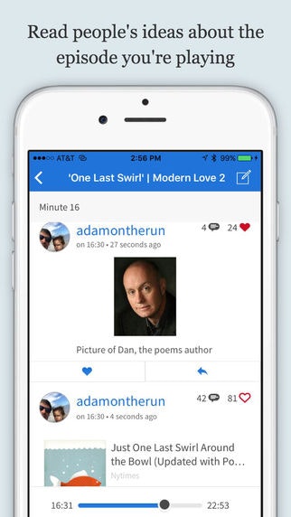 I created the app because I listen to podcasts at least an hour a day and wanted a way to talk with other fans about the ideas and guests that excite me. When a guest would be introduced, I want to see their picture, maybe browse through their tweets. When the host makes an interesting point I want to talk about it.
