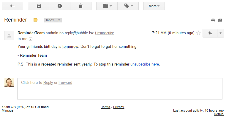 This is a project I built over the weekend that was originally just for myself but thought might be useful to others. You can send a reminder to yourself or someone you know. No login required. It's simple, but does the job.
