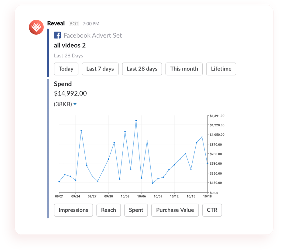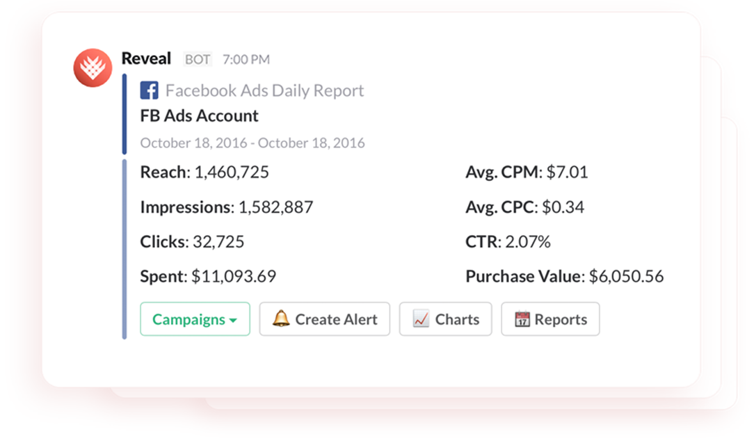 Reveal is advertising chatbot that warns you when your ads become unprofitable and brings you metrics and insights on your ad campaigns. You can set up alerts for any metric like CTR or CPC and instantly react to changes righ… See more