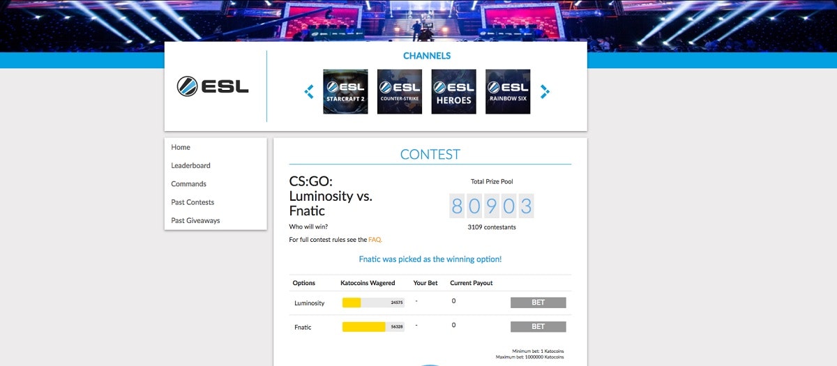 Really cool stuff, I think the gambling part would be huge if adopted by big eSports events. For example Dreamhack has a ton of empty time slots on stream that could be easily filled with something like this in order to keep people engaged and have them stick around until the next match, no more ResidentSleeper spam in chat!