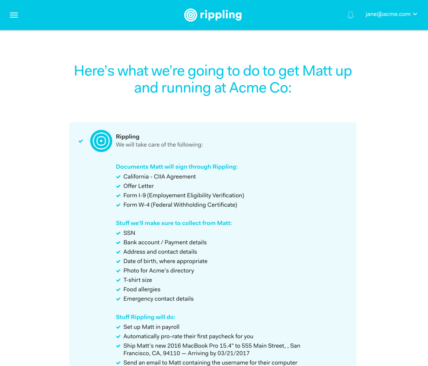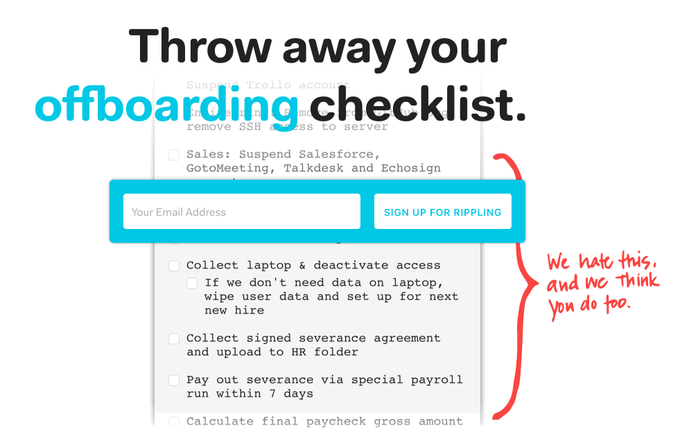"Rippling automatically does the 100 little things that IT, HR, Facilities, Legal, Finance, and employees have to do when joining, working at, or leaving a company. From buying a computer to running payroll."