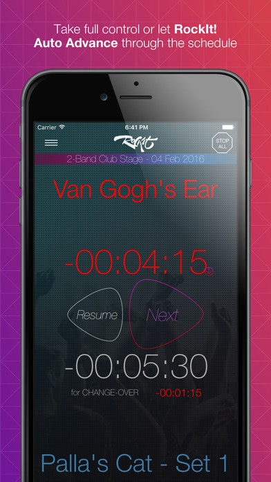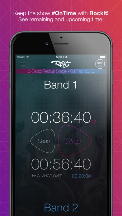 Originally designed for live music performances, RockIt! works great for any live event where time is critical and one segment of the event running early or late has consequences for the rest of the event (weddings, conferences, speaking events, etc.)