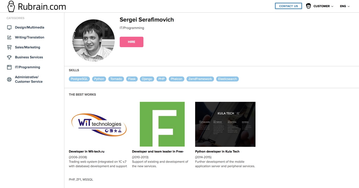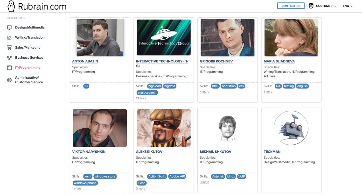 Currently, there are approximately 1000 freelancers in our database. Each one has undergone a rigorous screening process and was rated by one of the founders. Besides engineers, RuBrain offers experts in design, marketing, and sales.