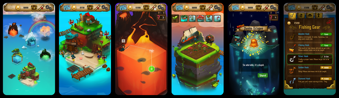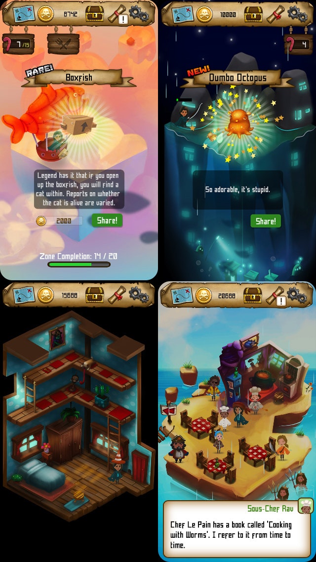 Become the greatest pirate captain that ever fished! Add more pirates to your burgeoning island town! Listen to all their nonsensical complaints! Fish in ludicrous locations like swamps, active volcanoes and the sky!