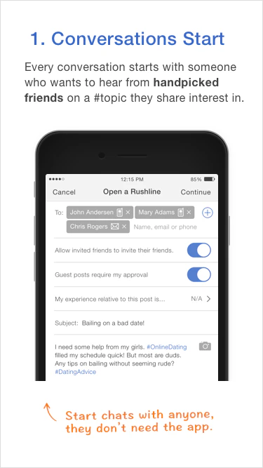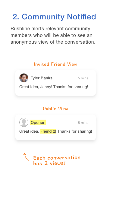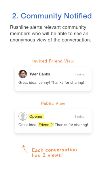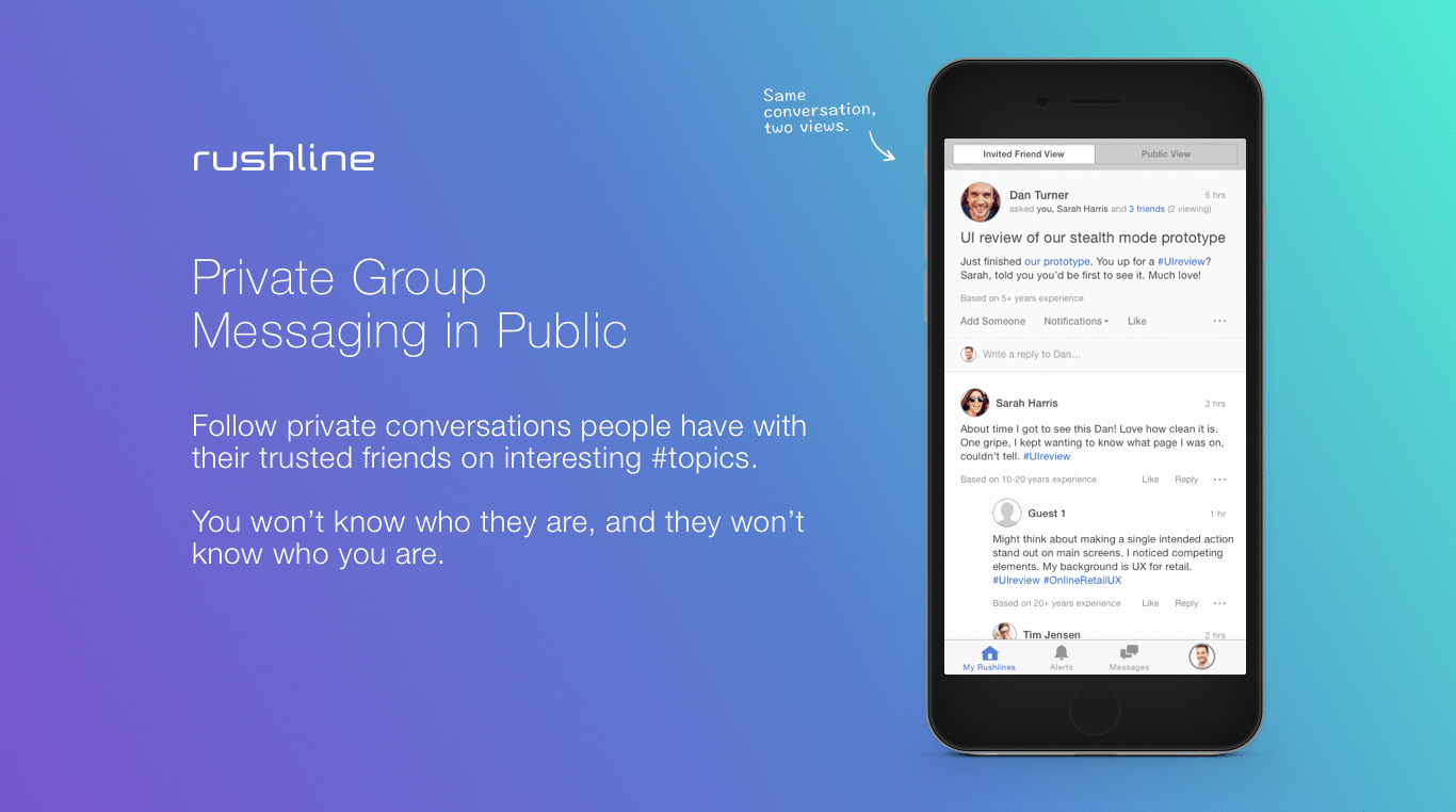 User comprehension was one of the biggest challenges of our beta. We found Rushline challenges deeply held expectations of privacy and how conversations work. We did finally get through, keying off the ability to follow other people's private conversations.