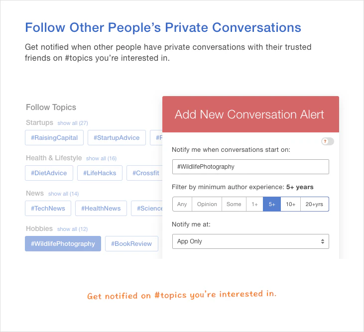 To see how it works, sign up to follow conversations on any #topic you're interested in, from startup advice to product news or something personal. Available on web and iOS.