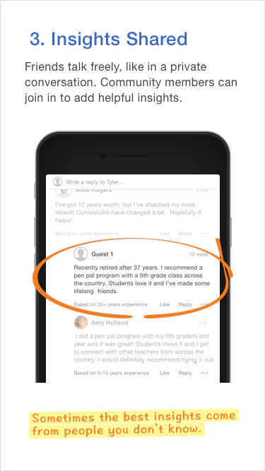 After talking with many, I learned most of us prefer going to select friends for advice, rather than strangers. These conversations are trusted and private (no reputation risk, no trolls and zealots). And when our friends ask us for insights, we’re happy to help.