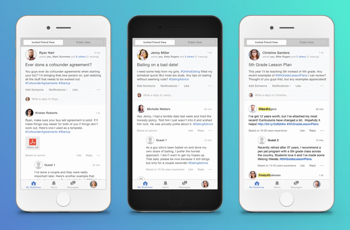 I was an early beta tester of Rushline and I'm excited to keep using it as it expands. I found it very easy to use, fast to log in, and what I liked most is that I could solicit "group think" from people I trust and choose, while also having the option to bring new people into the conversation. It's definitely a different way of sharing ideas and asking for advice, but I do believe it's the smarter way and will take off.