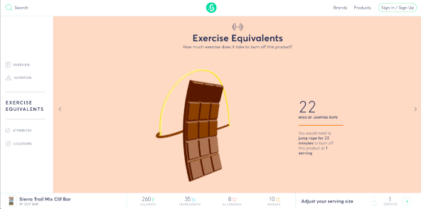 Beautifully designed. My favorite part: the exercise equivalents. E.g. you'll need to jump rope for 21 minutes to burn off one serving of this chocolate bar: