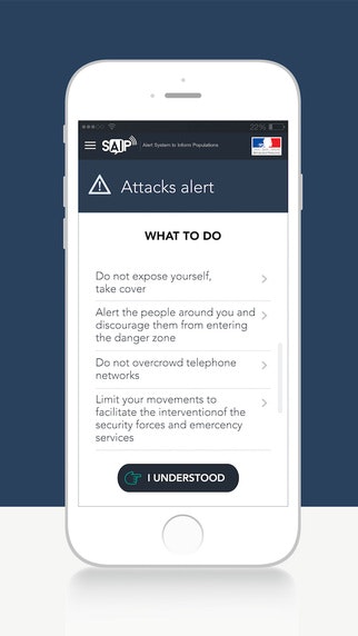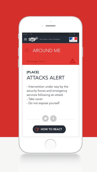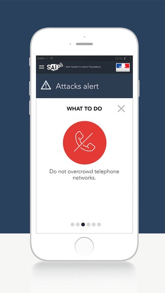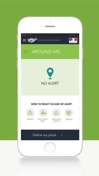 "This free application allows users to receive alerts in the case of exceptional events (nuclear, hazardous materials, and hydraulic structure failure alerts, etc.) that may result from an attack within a specified geographical zone, providing that the user’s geolocation settings are activated and that the application is active."