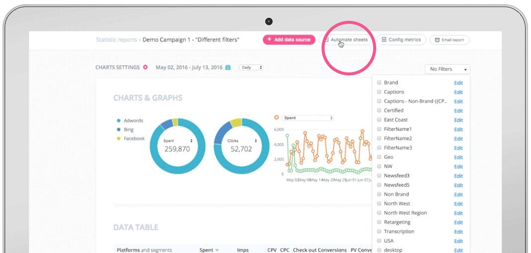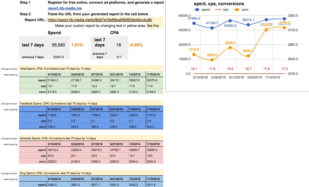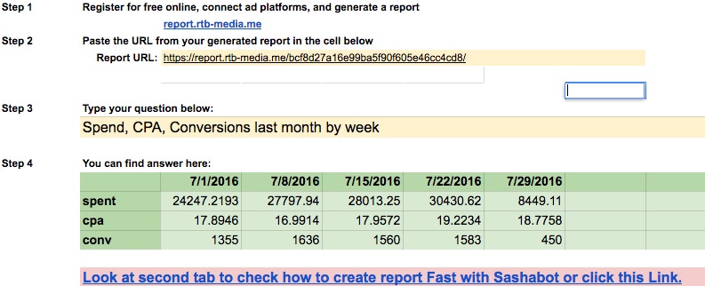 SashaBot is Artificial Intelligence for ad campaigns that lives in Google Sheets. Ask SashaBot questions about your digital ad campaign's performance using ordinary words, and she will give you an answer.