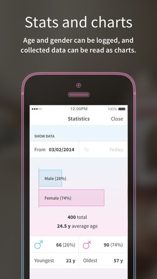 "Age and gender from the scanned licenses can be logged and collected data transformed into beautiful charts. Just select start and end date, Scannr will do the rest."