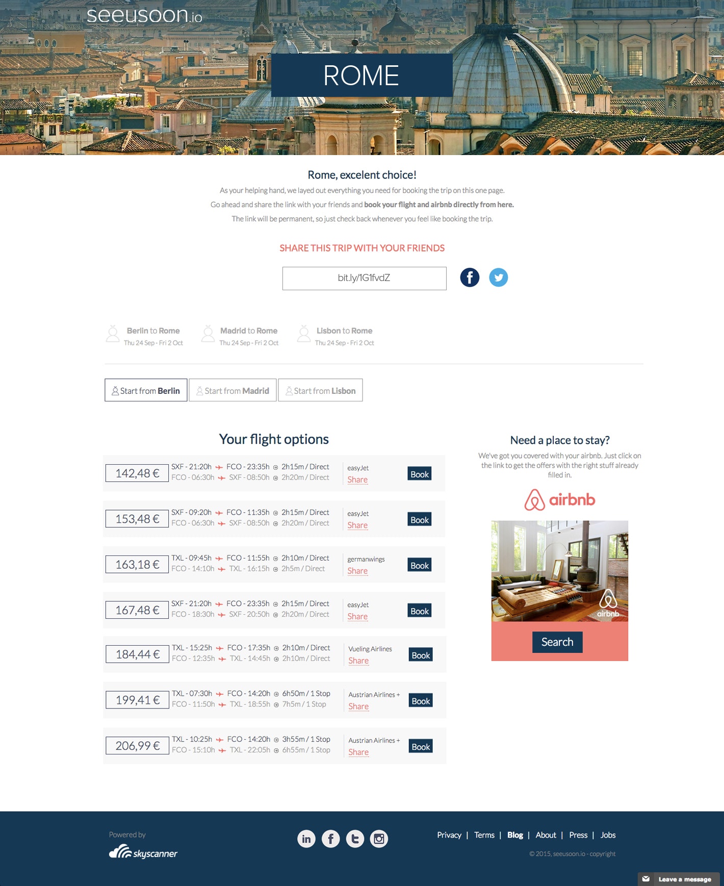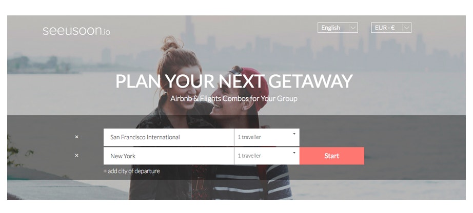 seeusoon.io is a free trip planner that offers combos of flights + short term rental accommodation to its users. One of its key features is that it matches travellers from multiple locations to cheapest common destination city.