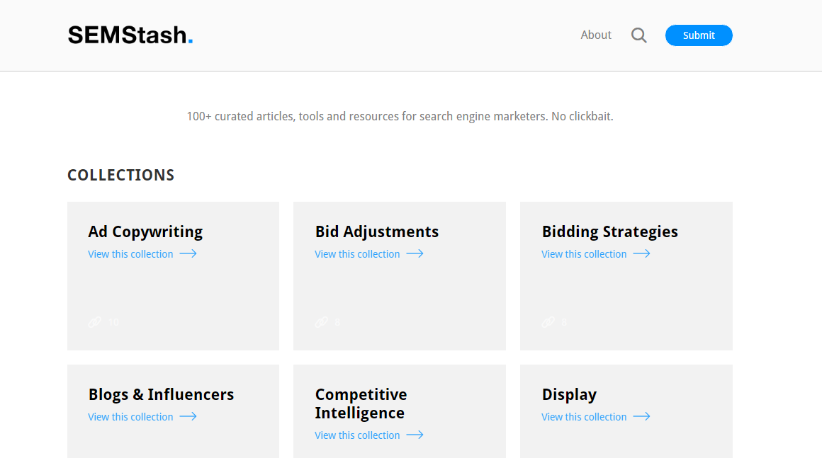 SEM Stash is a collection of 100+ curated articles, tools and resources for search engine marketers.