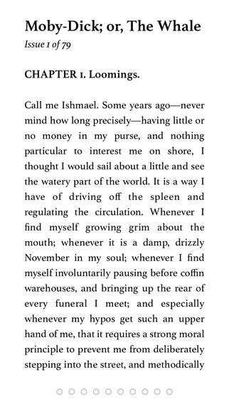 Interesting idea and well-designed. Intriguing concept, but it's strange to charge people for access to books that are already free elsewhere, such as an iBooks. 24 hour forced wait time between chunks is also somewhat arbitrary.