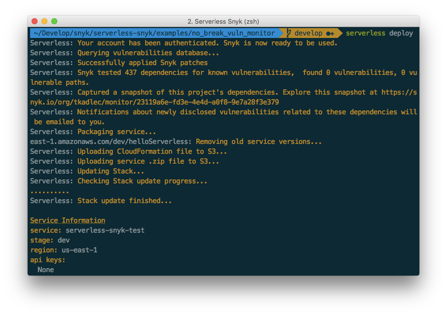 It’s an easy to install plugin between the Serverless Framework and Snyk.io, which can block or alert when you’re about to deploy a vulnerable package. It also helps you apply continuous security by remembering the dependencies you deployed and sending you alerts about newly disclosed vulnerabilities that affect you.