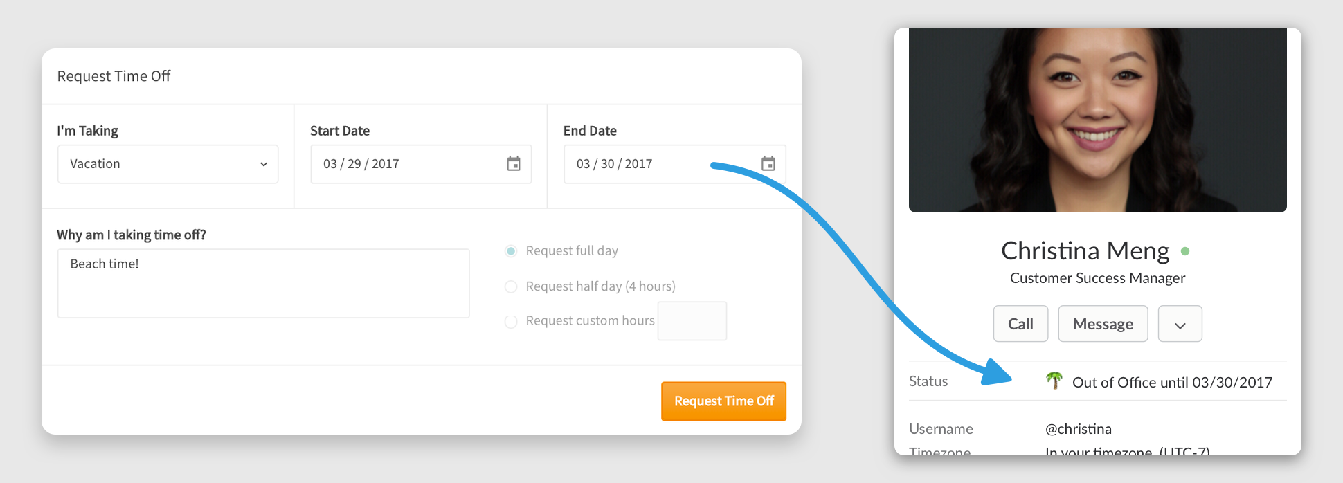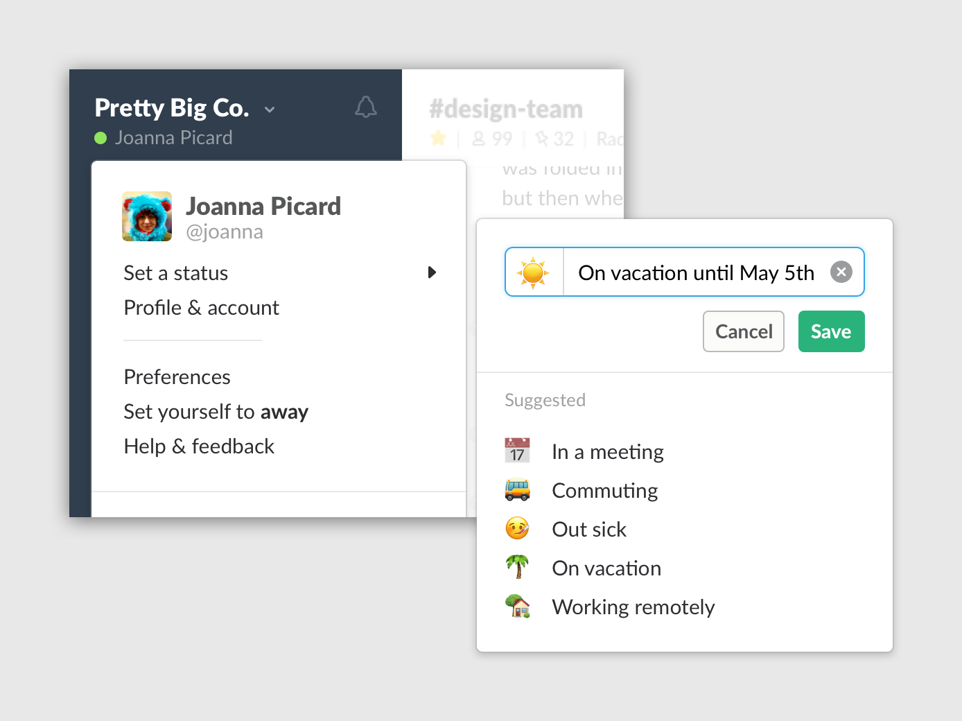 You can now set your status to let your team know when you’re available or when you’re not. Choose from a default status for common scenarios where you’re away, or create a custom status with the perfect emoji for anything else you want your team to know.