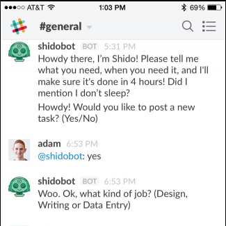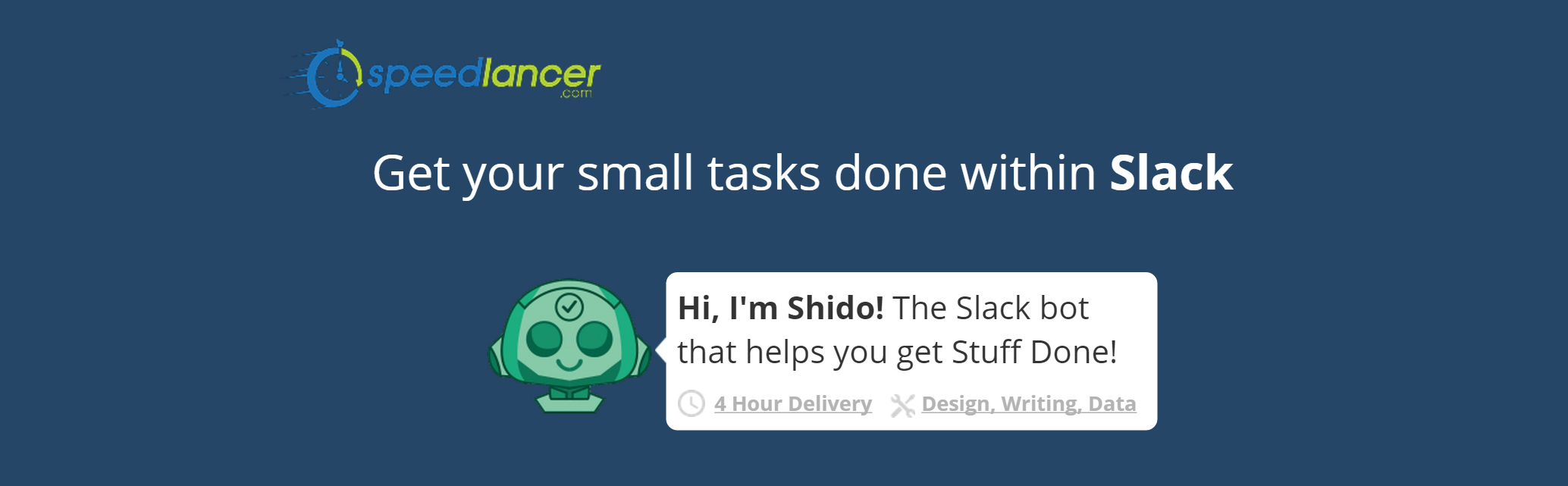 Very excited about this launch of Shido - this is a bot to help you get 'Sh*t Done' by the highest quality freelancers *within Slack itself*, in just 4 hours (powered by Speedlancer.com). Now you don't have to think about how to get things done; just talk to Shido within Slack and have it delivered!